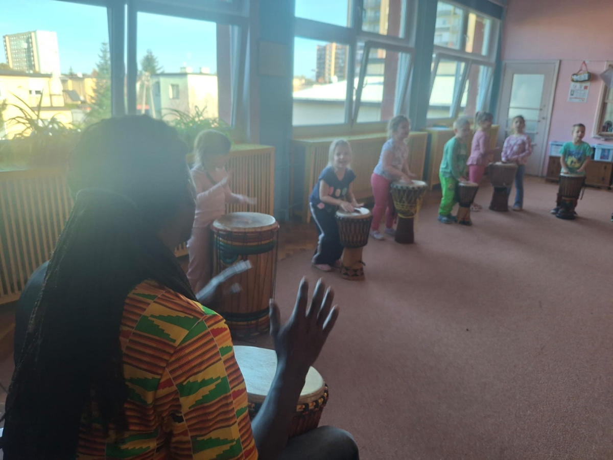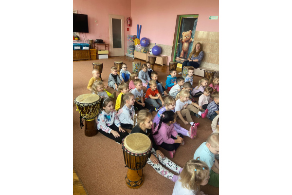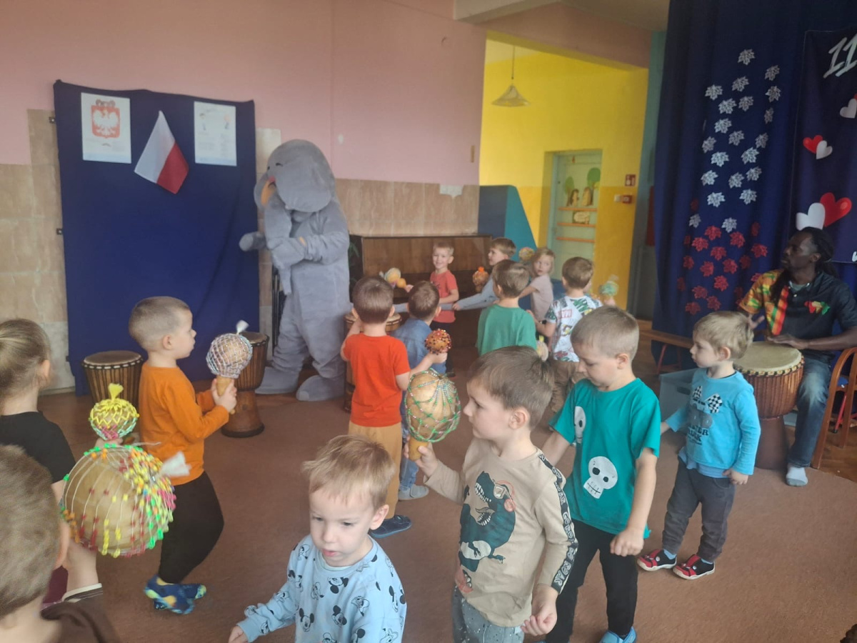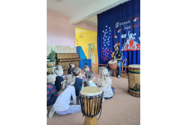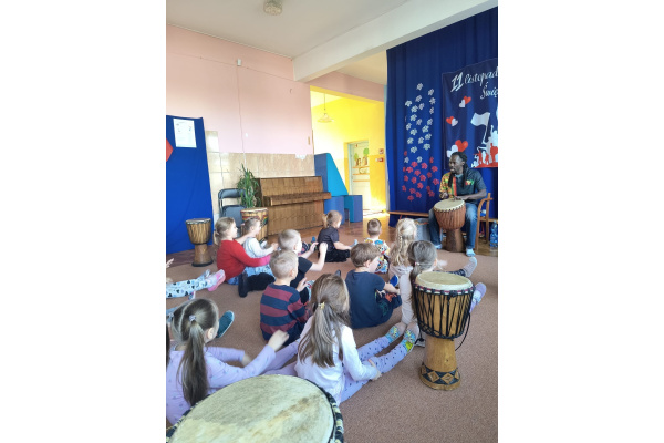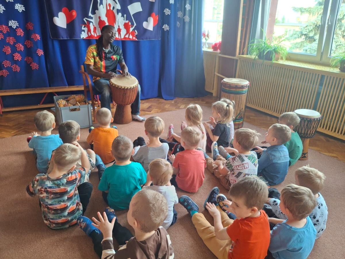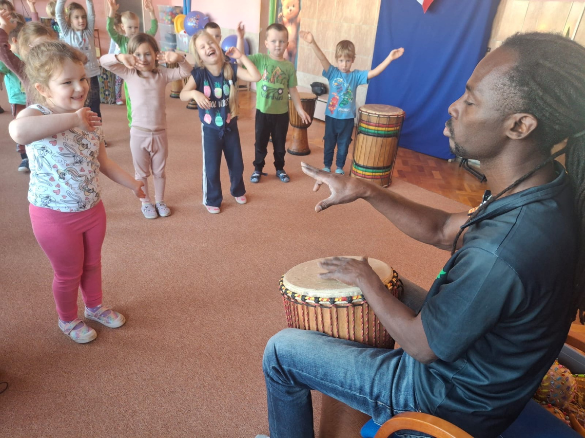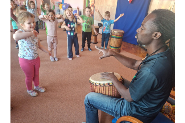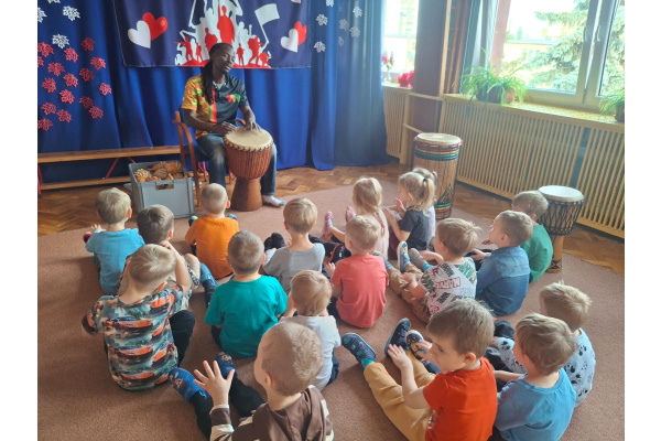 We wtorek w naszym przedszkolu odbyły się warsztaty bębniarskie, podczas których dzieci miały okazję poznać kulturę odległej od nas Afryki. Przedszkolaki pod okiem Pana Gasparda Conde grały na bębnach i grzechotkach. Były to zajęcia pełne radości, muzyki i tańca.