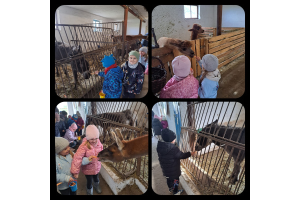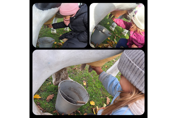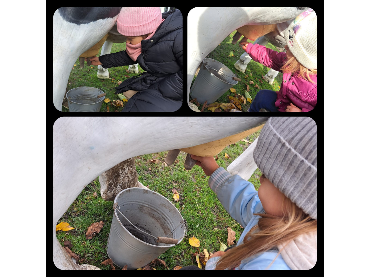 Zajączki miały również okazję spróbować swoich sił w dojeniu krowy oraz poznać wiejskie zwierzątka- karmiły je i obserwowały z wielkim zainteresowaniem.