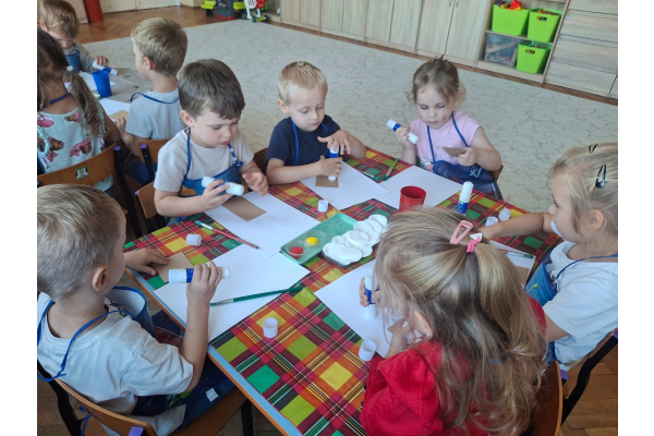 Dzieci z 5 grupy na zajęciach plastycznych wylepiały kontury baranków . Użyły do tego kulki styropianowe i bazie kotki. Powstały piękne pracę.