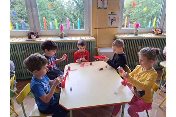 W piątek w ubiegłym tygodniu ,w ramach podsumowania tematyki ekologicznej, dzieci, które przyniosły butelki po napojach, wykonywały prostą zabawkę zręcznościową. Zadanie było jednak wymagające uwagi i umiejętności bezpiecznego posługiwania się narzędziami do tego niezbędnymi. Pod czujnym okiem pani dzieci cięły nożykiem i próbowały posługiwać się pistoletem do kleju. Na zdjęciach- też wykonywanych przez dzieci- widać skupienie na twarzy i emocje towarzyszące pracy. Zadanie zostało wykonane doskonale.