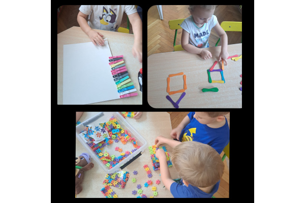 Dzieci rozwijały swoją kreatywność, wyobraźnię oraz motorykę małą poprzez manipulowanie różnorodnymi materiałami (klamerkami, drucikami kreatywnymi, kolorowymi patyczkami po lodach, klockami). Dowolność w działaniu bardzo im się podobała, a efektem były pomysłowe i oryginalne dzieła.