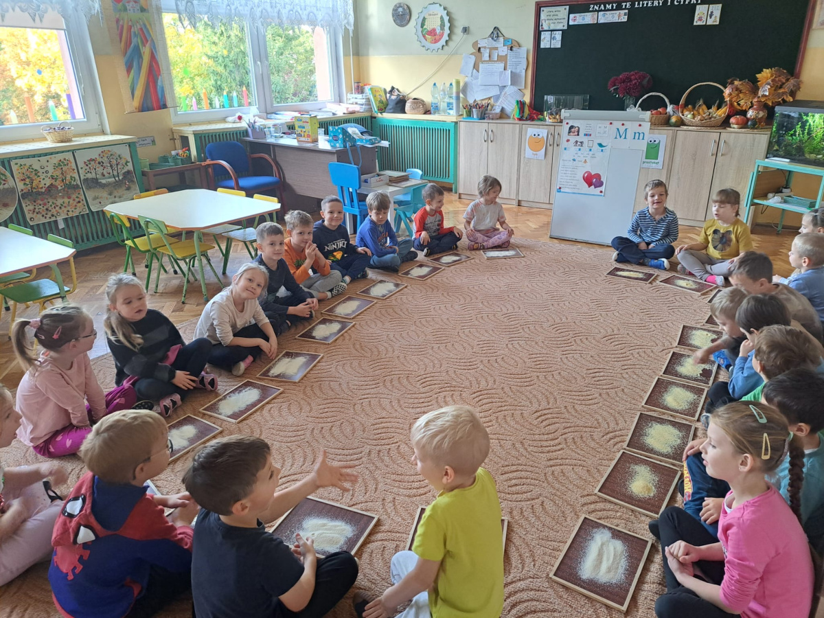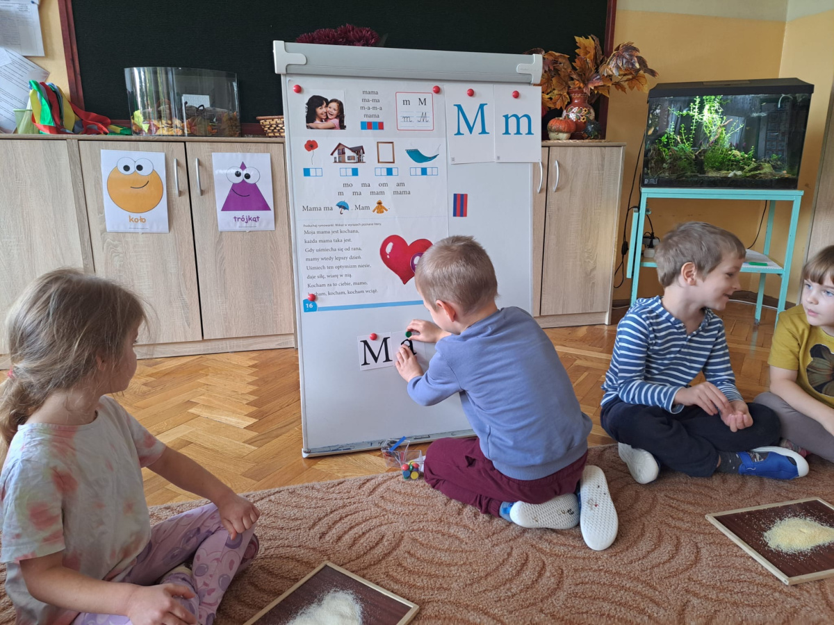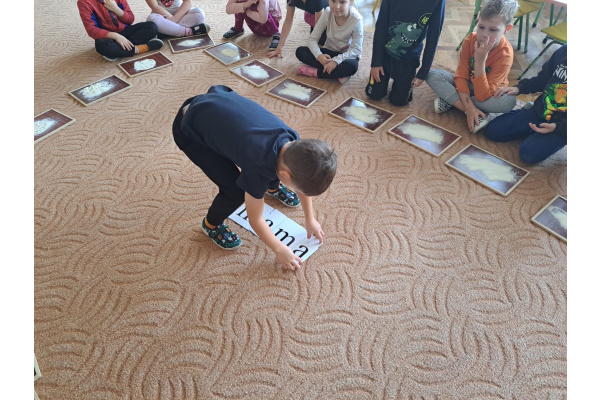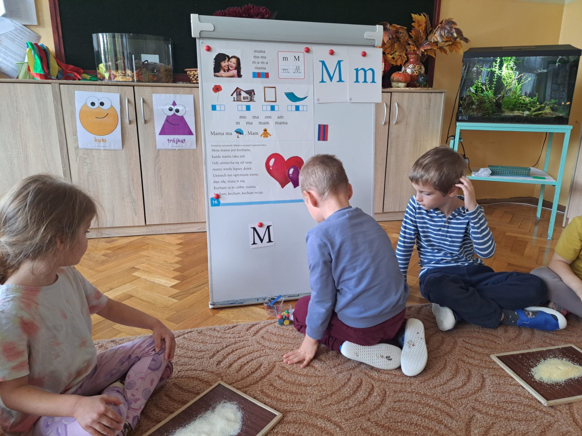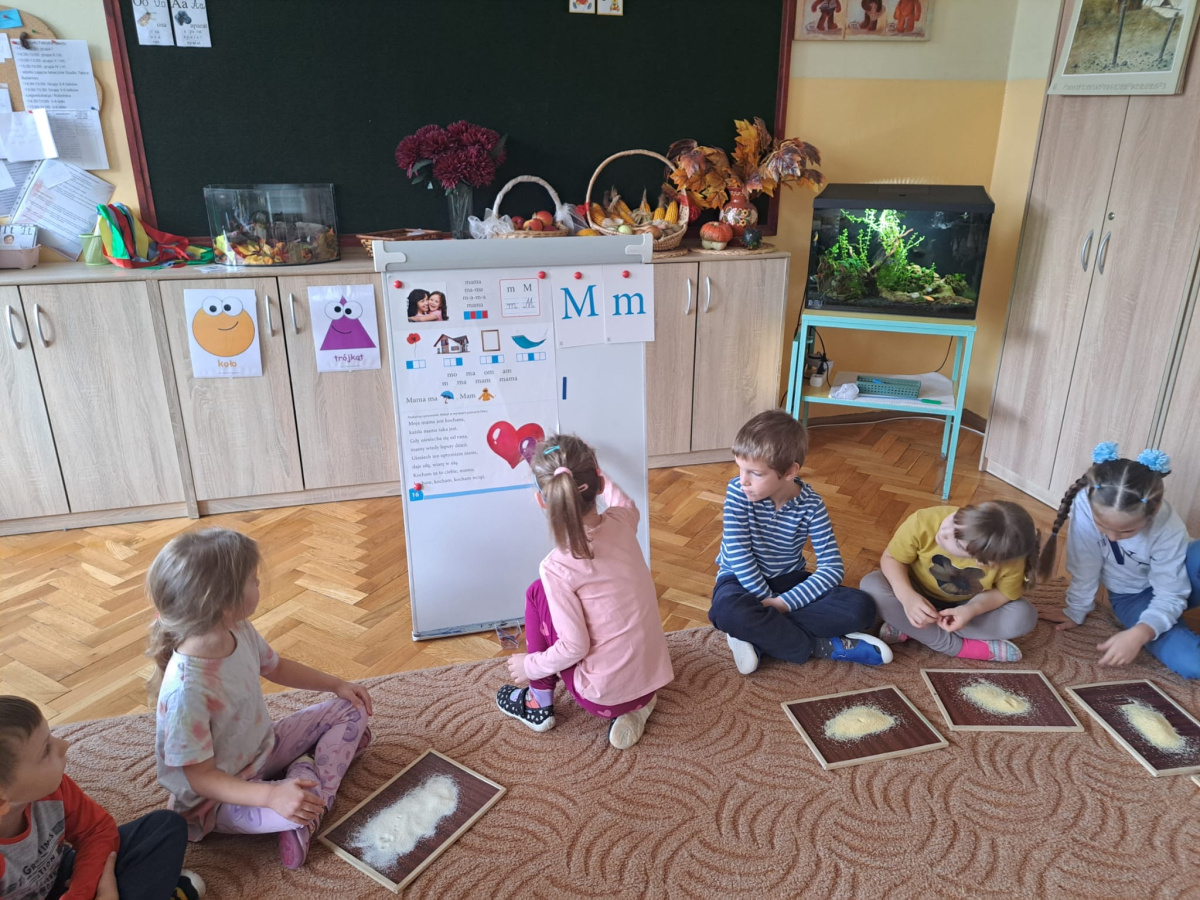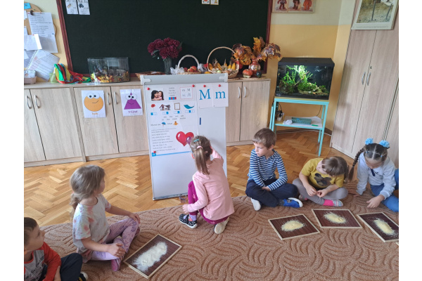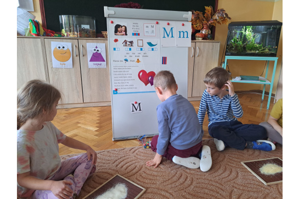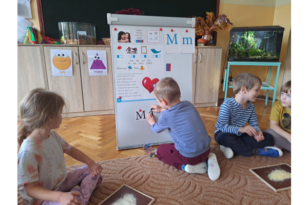 W tym tygodniu poznaliśmy pierwszą spółgłoskę "m" Aby ją utrwalić wyszukiwaliśmy wyrazów zaczynających się na tę głoskę, rysowaliśmy małą i wielką literkę "m,M" na tackach z kaszką manną , próbowaliśmy ułożyć wyraz "mama" , ozdabialiśmy kredkami poznaną dziś literkę.