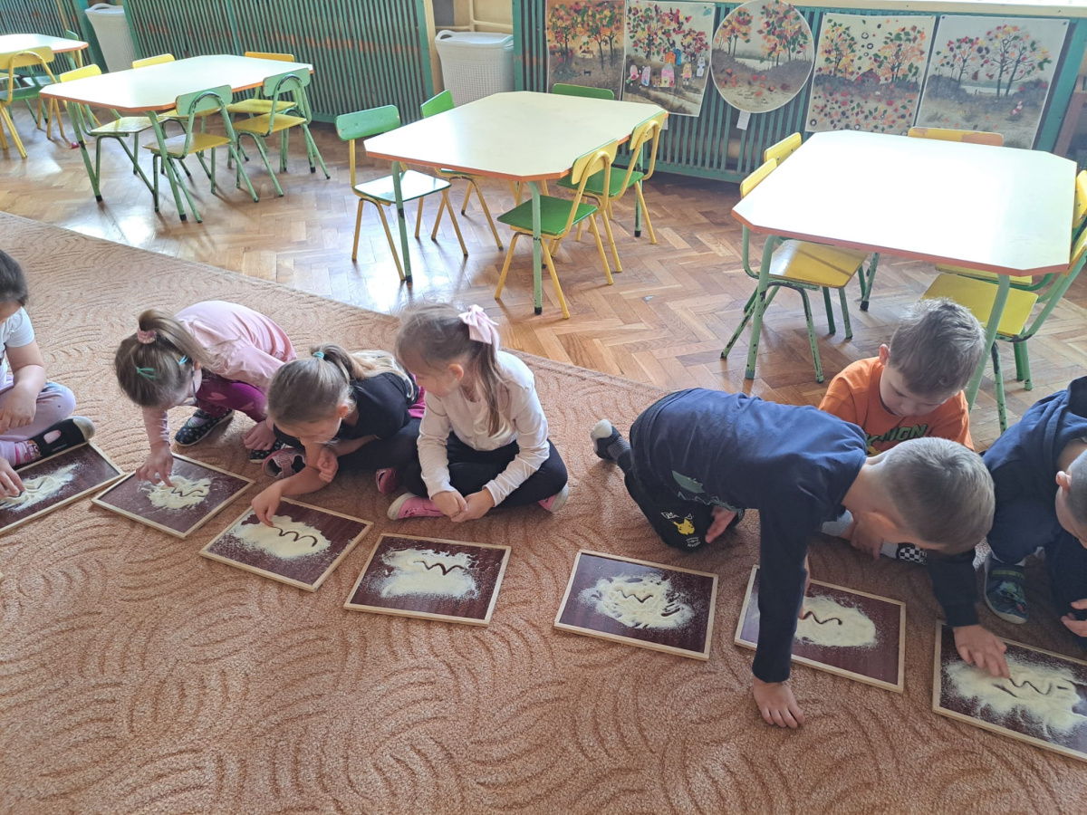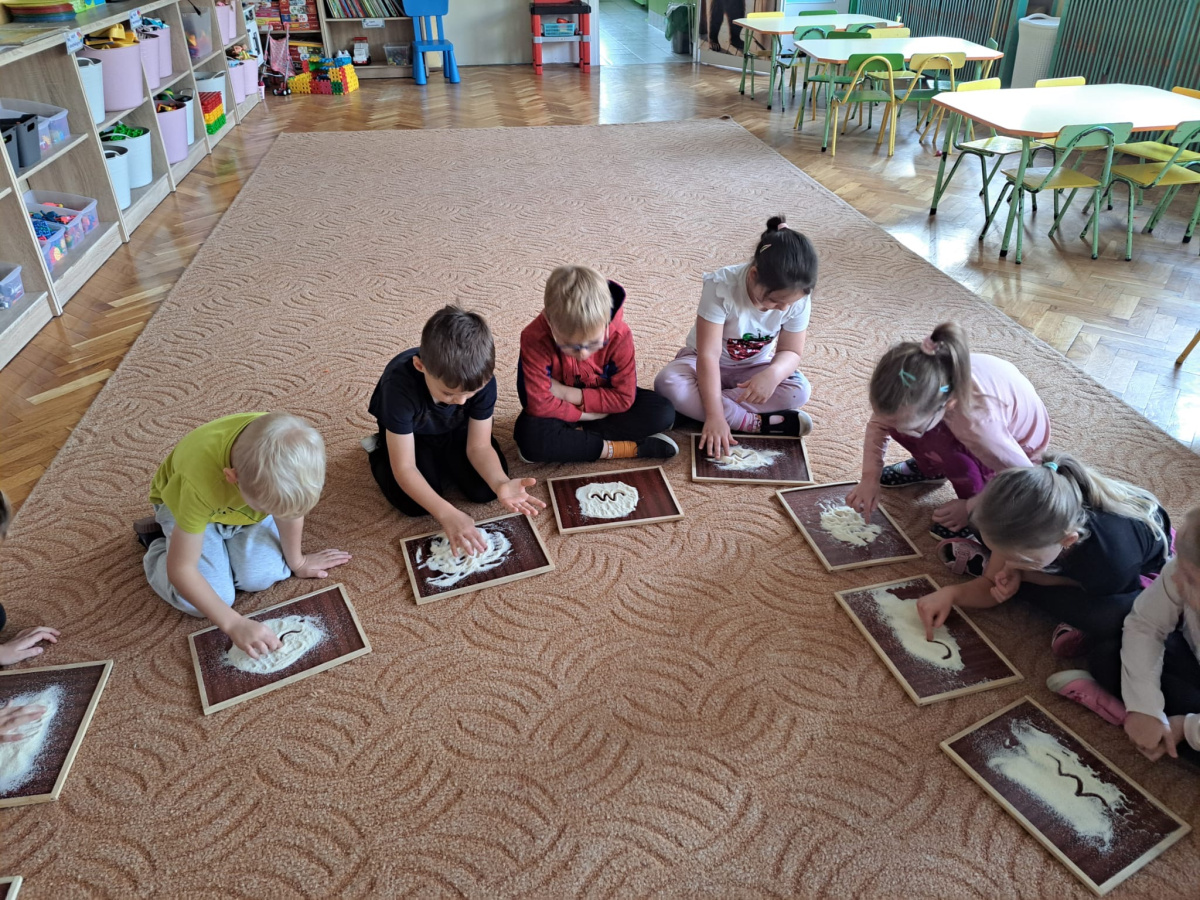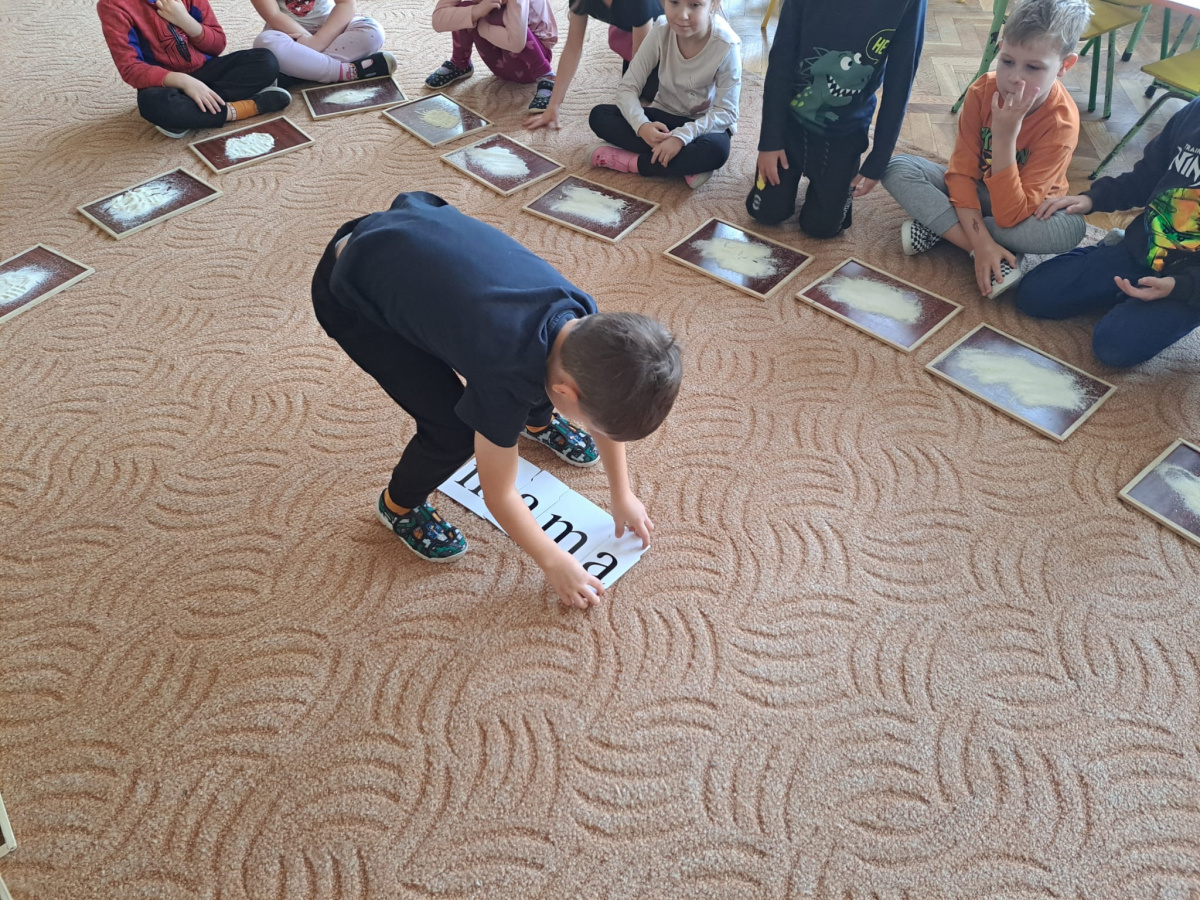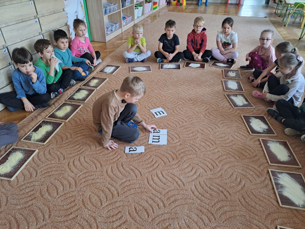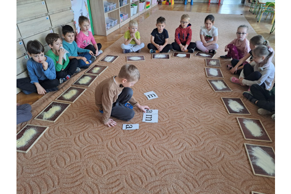 W tym tygodniu poznaliśmy pierwszą spółgłoskę "m" Aby ją utrwalić wyszukiwaliśmy wyrazów zaczynających się na tę głoskę, rysowaliśmy małą i wielką literkę "m,M" na tackach z kaszką manną , próbowaliśmy ułożyć wyraz "mama" , ozdabialiśmy kredkami poznaną dziś literkę.