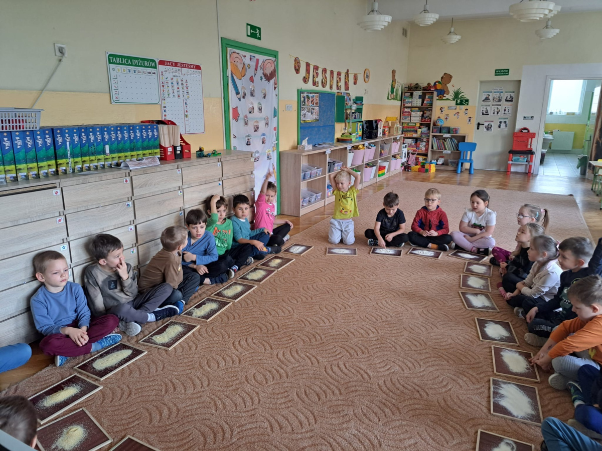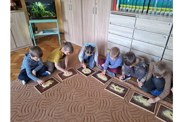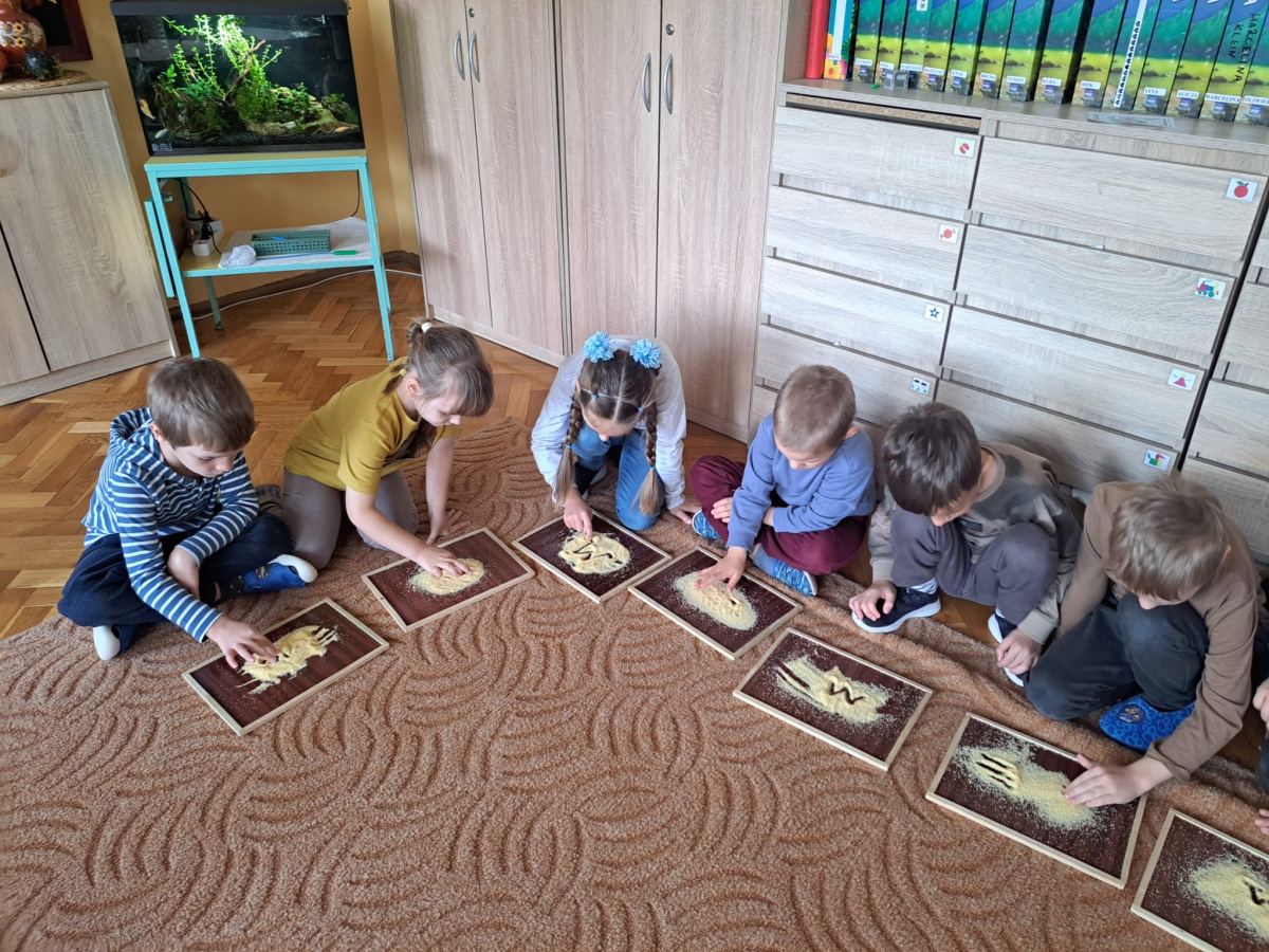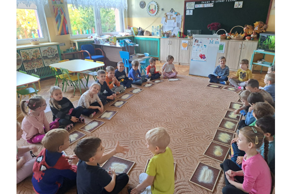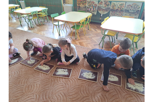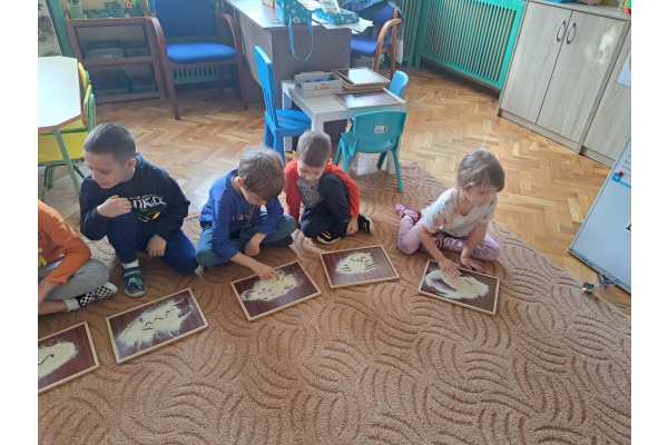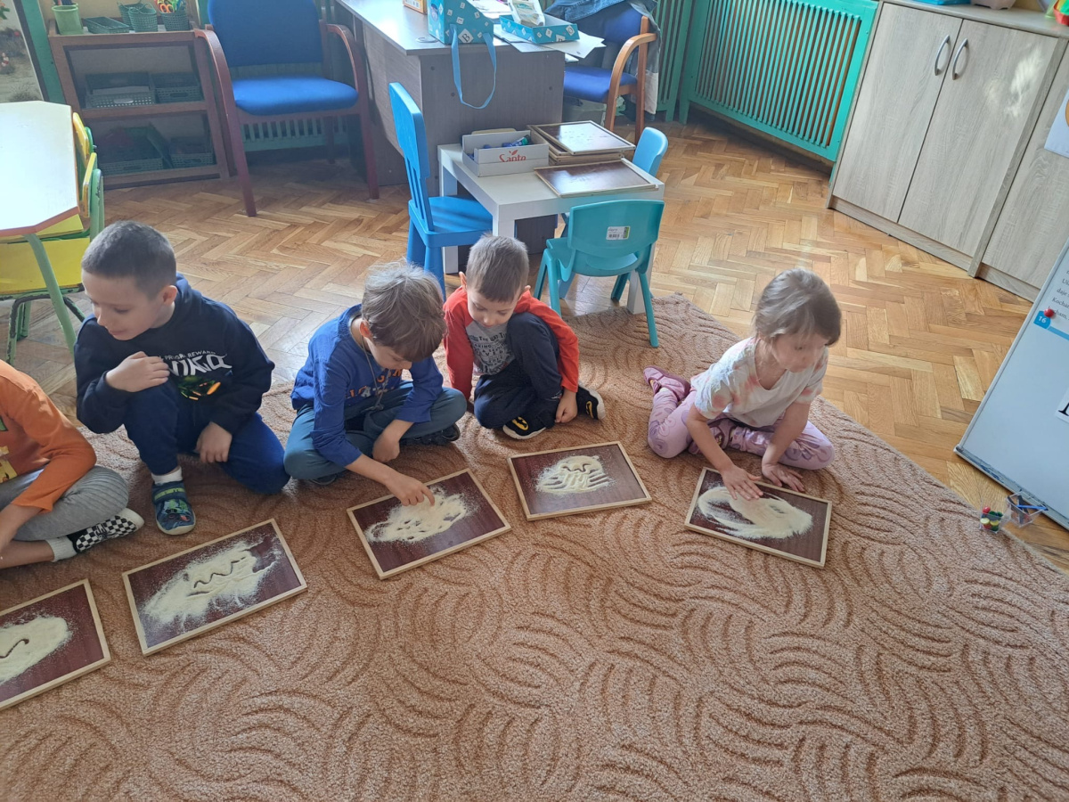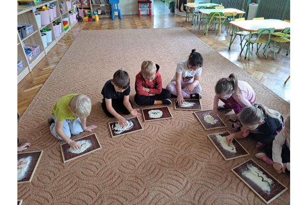 W tym tygodniu poznaliśmy pierwszą spółgłoskę "m" Aby ją utrwalić wyszukiwaliśmy wyrazów zaczynających się na tę głoskę, rysowaliśmy małą i wielką literkę "m,M" na tackach z kaszką manną , próbowaliśmy ułożyć wyraz "mama" , ozdabialiśmy kredkami poznaną dziś literkę.