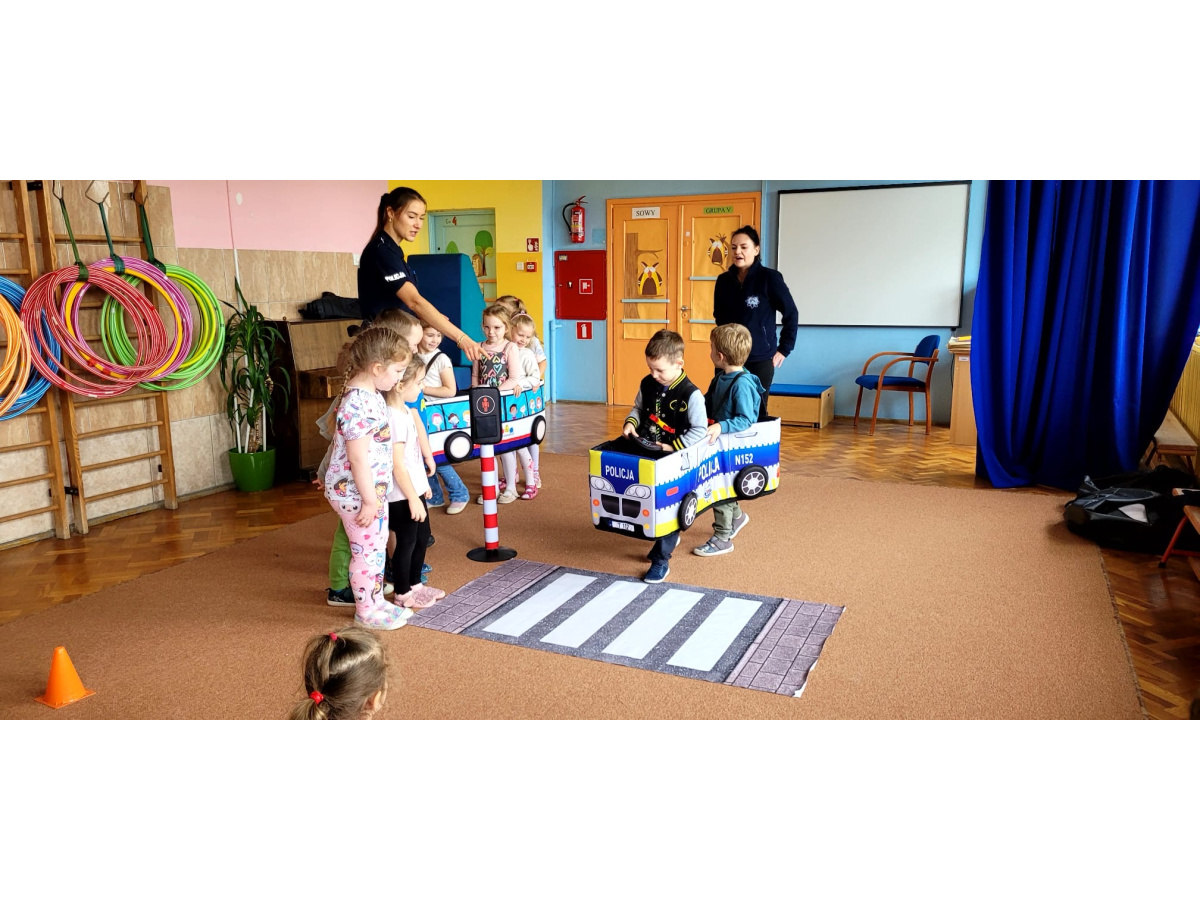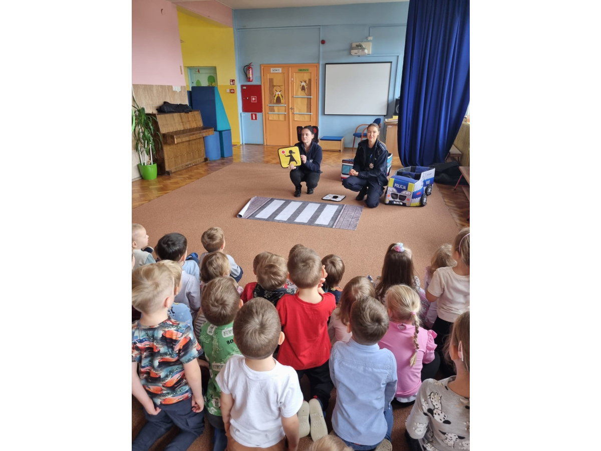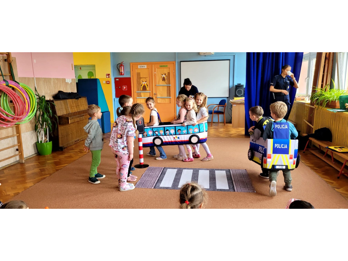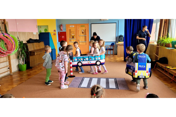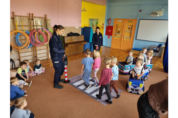 W miniony piątek nasze przedszkole odwiedziły panie policjantki i powtórzyły z dziećmi jak należy zachowywać się na drodze. Nie tylko opowiadały jak trzeba się tam zachować ale także odegrały się z dziećmi kilka scenek związanych z ruchem drogowym.
