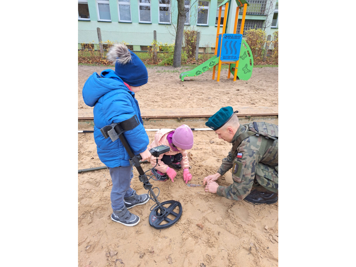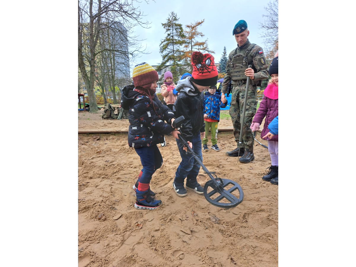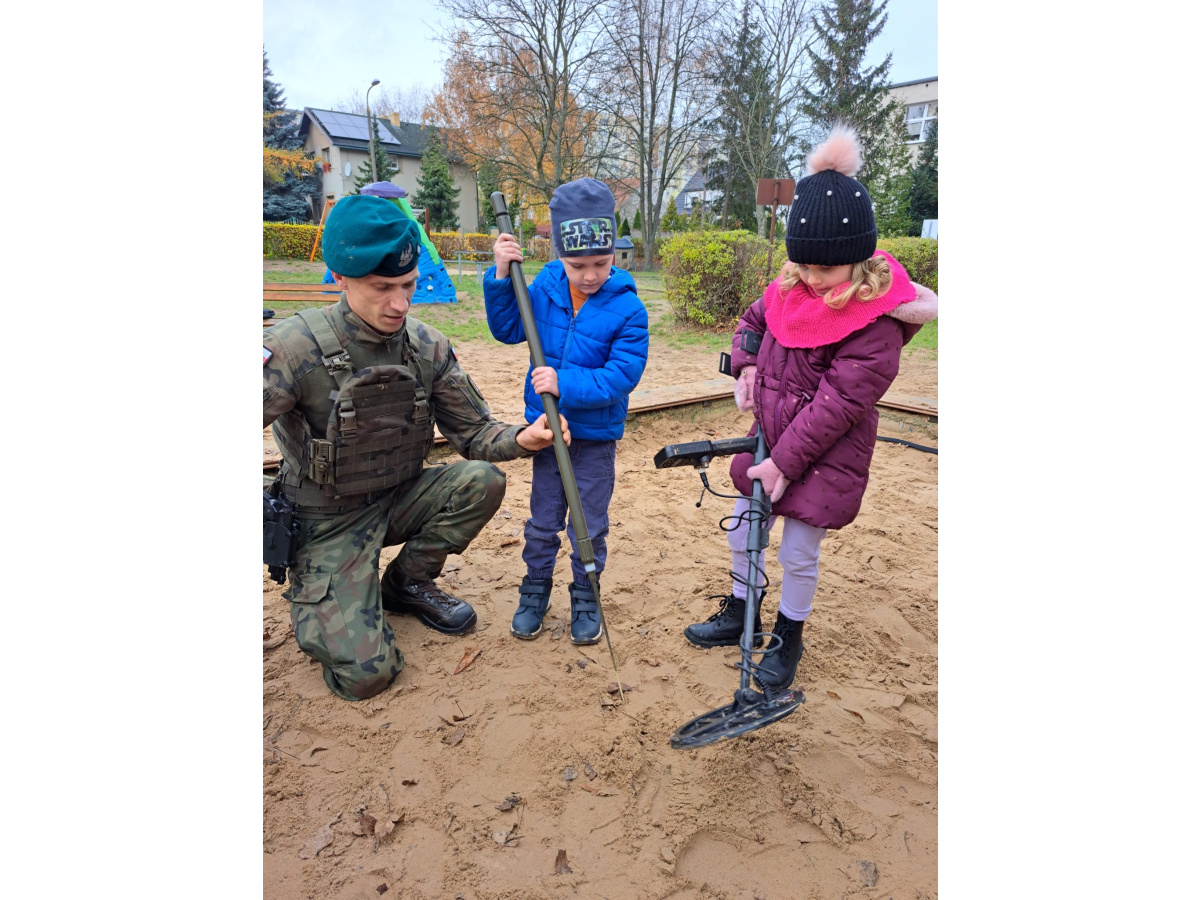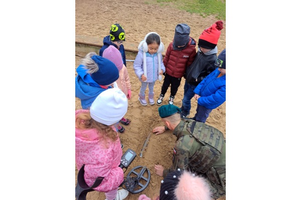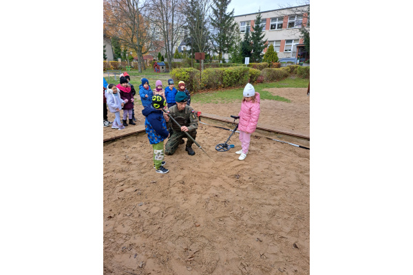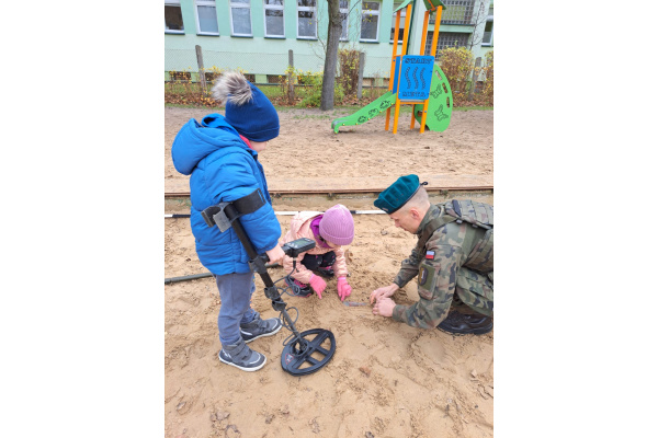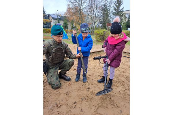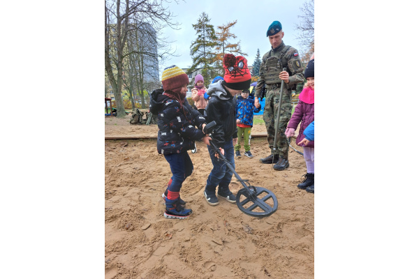 Podczas spotkania dzieci mogły zobaczyć, jak działa wykrywacz metali, a w przedszkolnej piaskownicy wspólnie „wyszukiwaliśmy pocisków”, ucząc się przy tym, jak należy postępować w przypadku znalezienia niebezpiecznego przedmiotu.