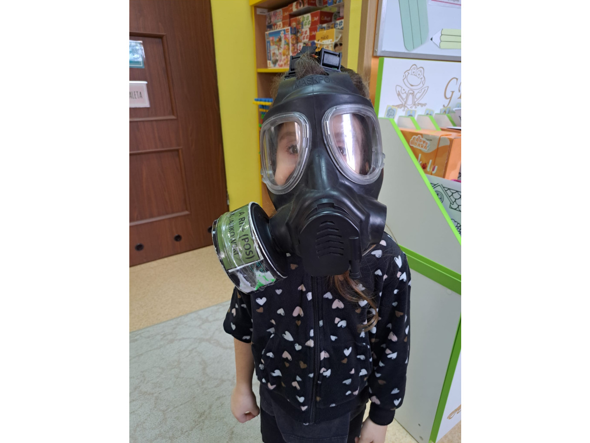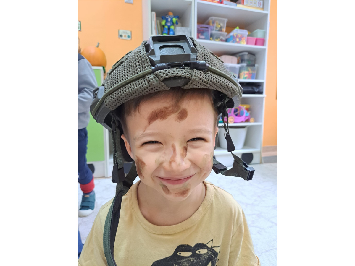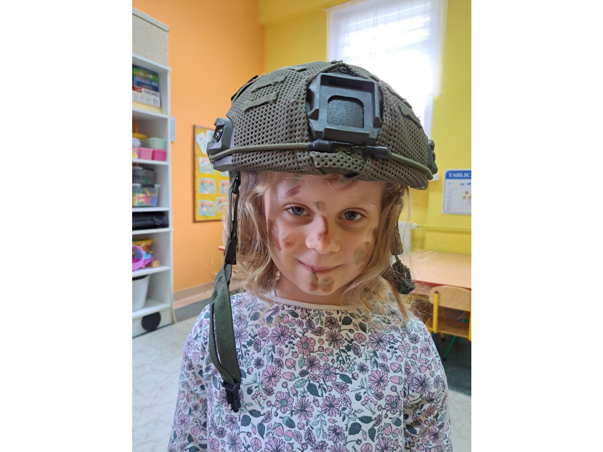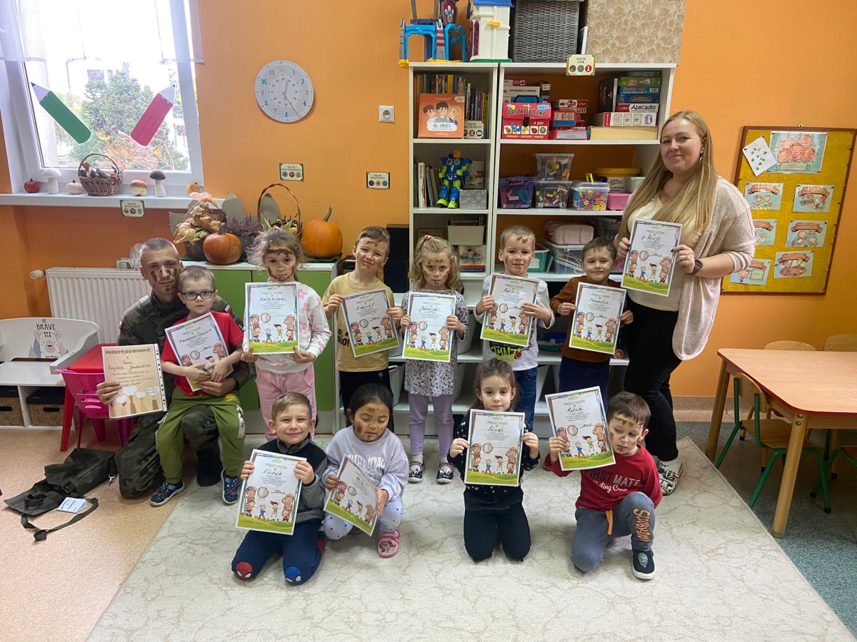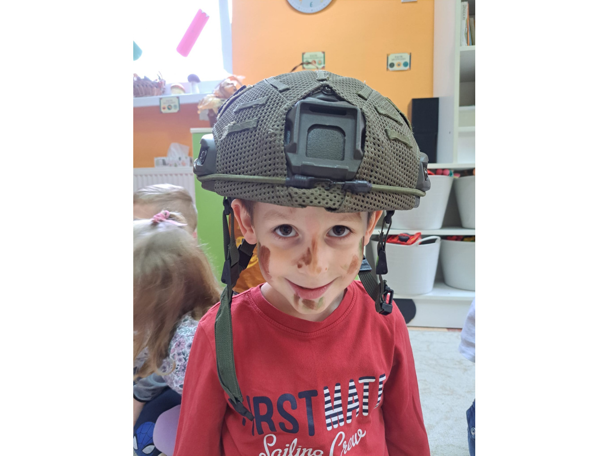 Pan Krzysztof opowiedział o tym, na czym polega służba sapera, jakie są jego zadania i jak ważna jest ostrożność oraz odpowiedzialność w jego pracy. Dzieci miały również okazję zobaczyć wyposażenie żołnierza – hełm, kamizelkę,maskę przeciwgazową oraz maskujące barwy ochronne.Spotkanie było niezwykle interesujące i pouczające,a przedszkolaki dowiedziały się, jak ważna jest bezpieczna postawa w sytuacjach zagrożenia oraz jak wygląda codzienna praca żołnierza Wojska Polskiego.
