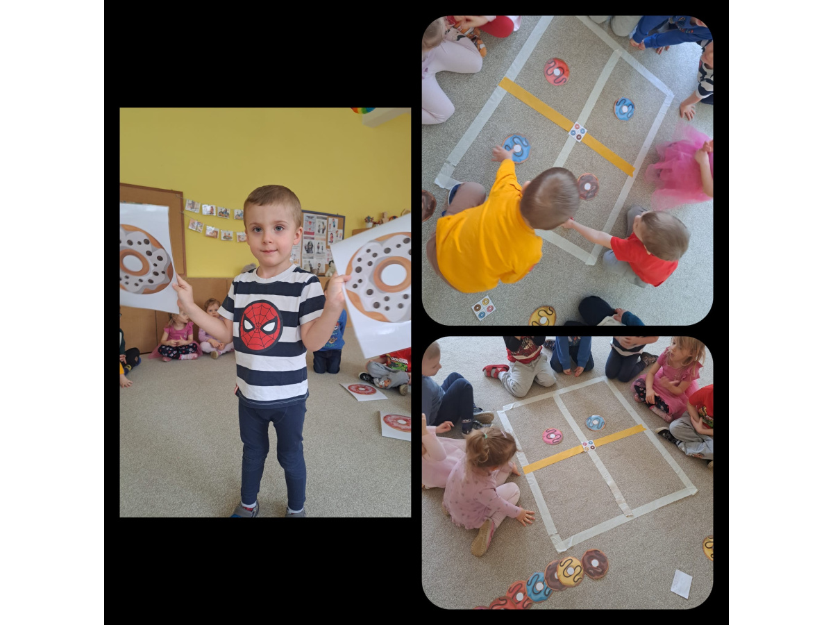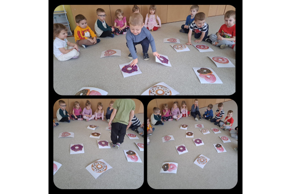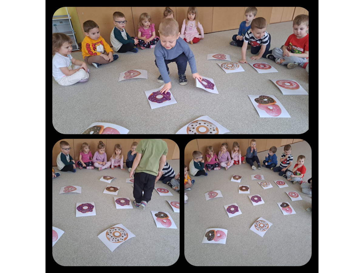 Przedszkolaki brały udział w aktywnościach rozwijających spostrzegawczość i logiczne myślenie: układały pączki według wzoru na siatce 2:2 wykonanej z taśmy malarskiej, wyszukiwały takie same pączki oraz opowiadały o swoich ulubionych nadzieniach i polewach.