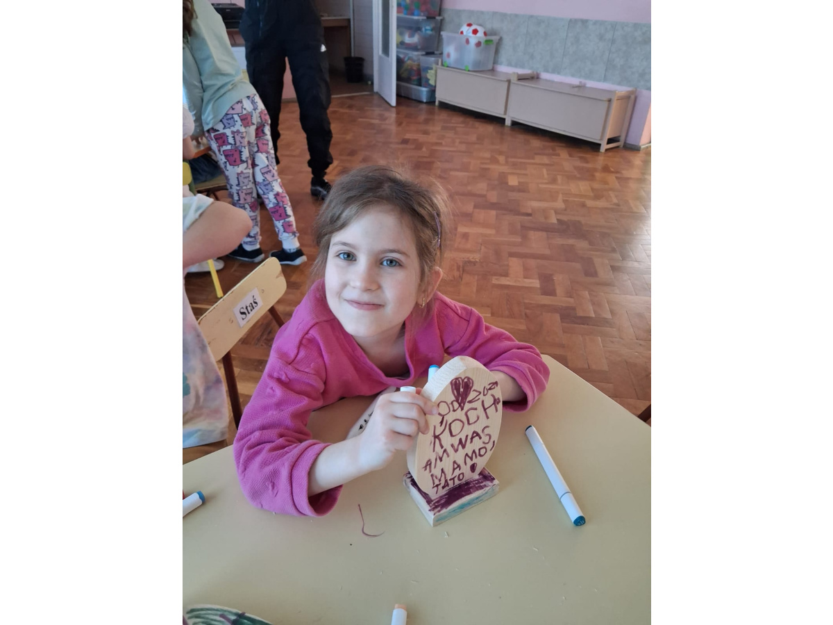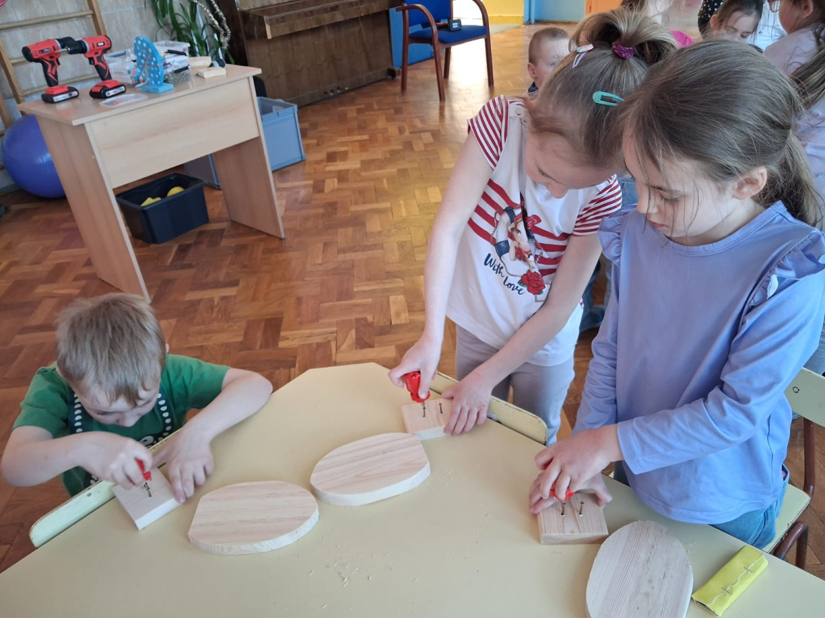 Warsztaty stolarskie w 5 grupie. Dzieci poznały podstawy stolarstwa, szlifowały drewniane jajeczka, wkręcaly wkręty w podstawkę, ozdabiały....
