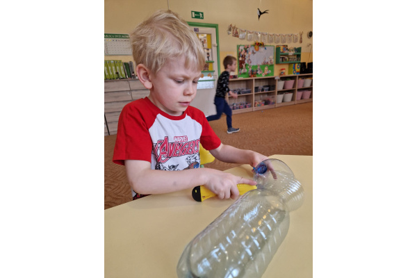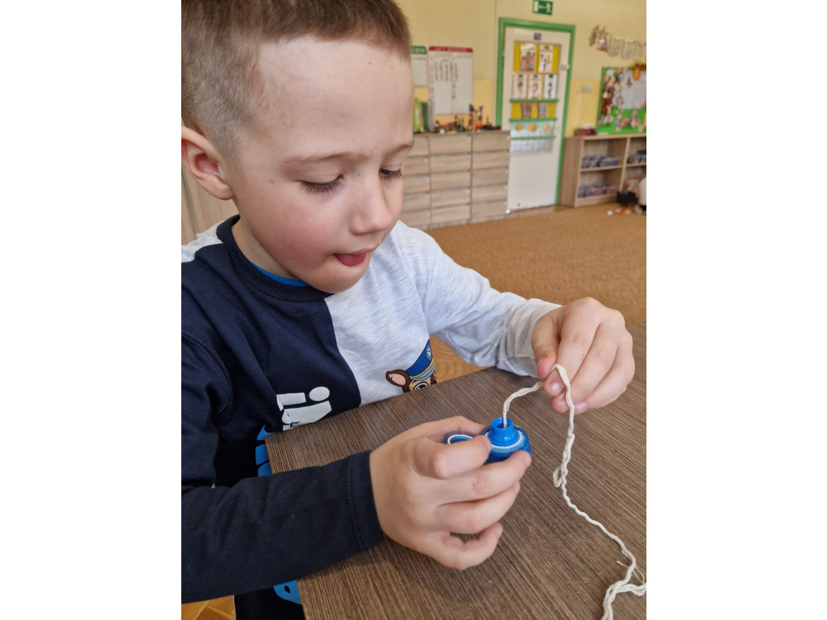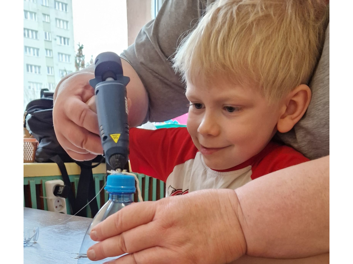 W piątek w ubiegłym tygodniu ,w ramach podsumowania tematyki ekologicznej, dzieci, które przyniosły butelki po napojach, wykonywały prostą zabawkę zręcznościową. Zadanie było jednak wymagające uwagi i umiejętności bezpiecznego posługiwania się narzędziami do tego niezbędnymi. Pod czujnym okiem pani dzieci cięły nożykiem i próbowały posługiwać się pistoletem do kleju. Na zdjęciach- też wykonywanych przez dzieci- widać skupienie na twarzy i emocje towarzyszące pracy. Zadanie zostało wykonane doskonale.