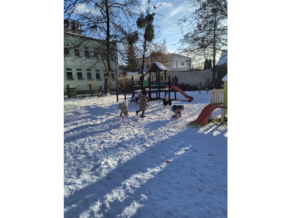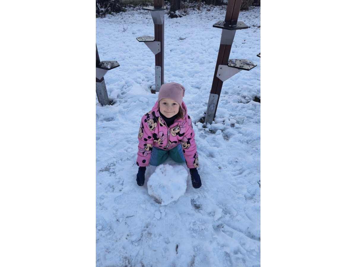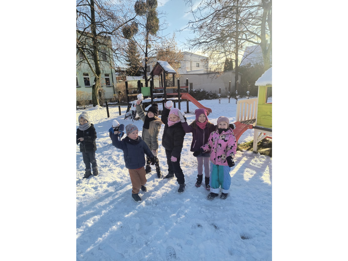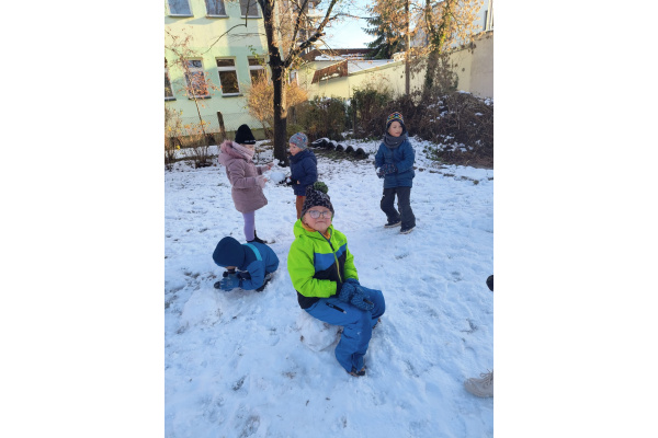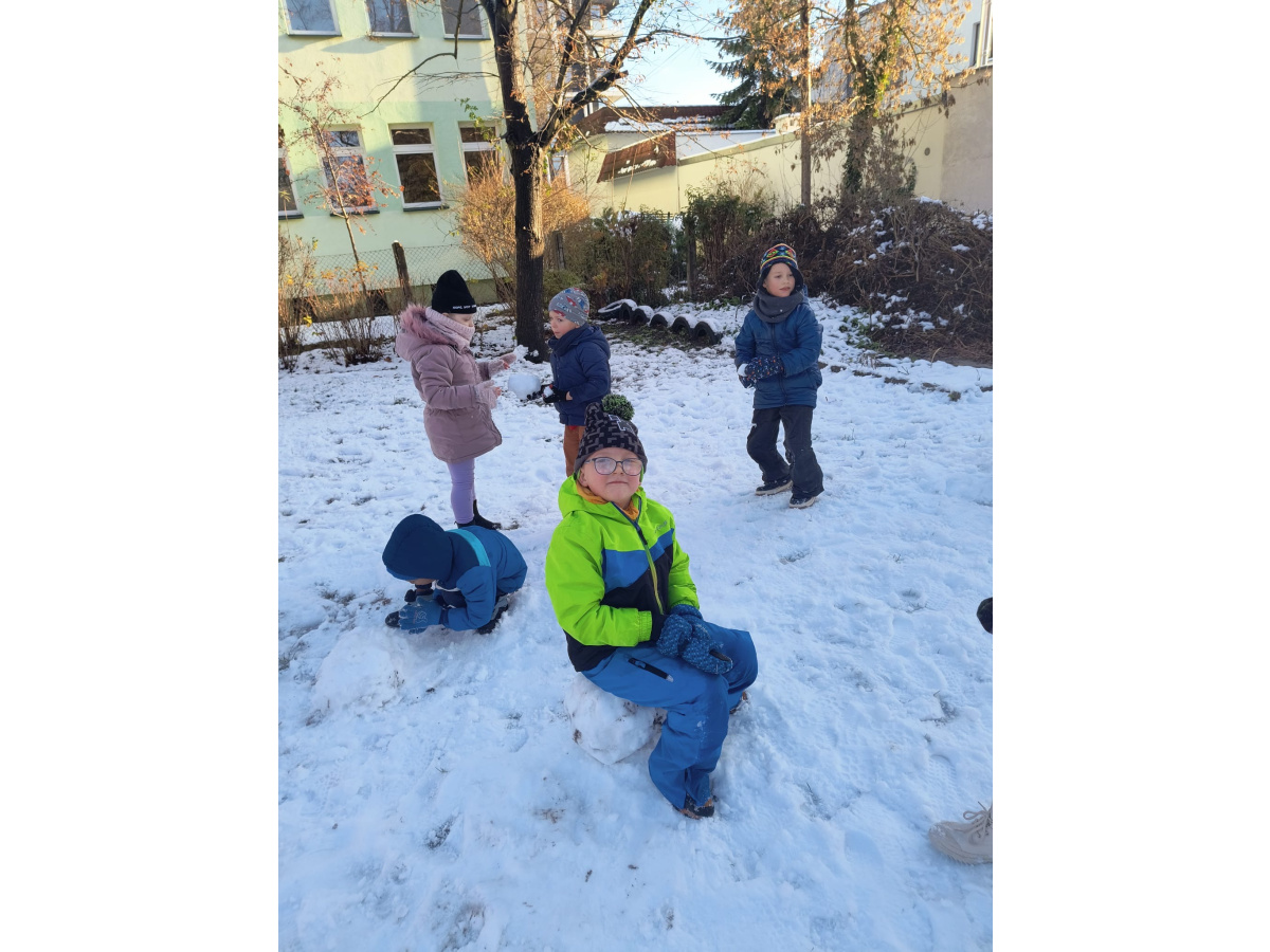 Opady pierwszego śniegu wywołały u dzieci sporo radości. Ogród przedszkolny pokrył się warstwą śniegu więc przedszkolaki urządziły bitwę na śnieżki, ulepiły bałwana i robiły śniegowe orzełki.