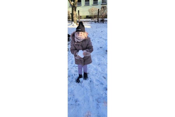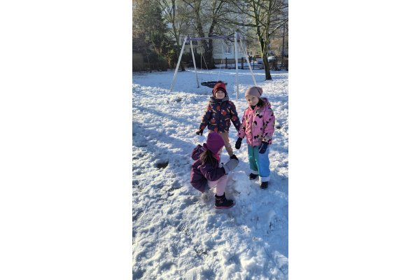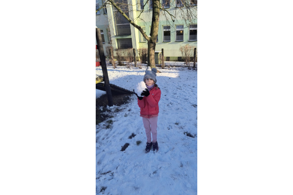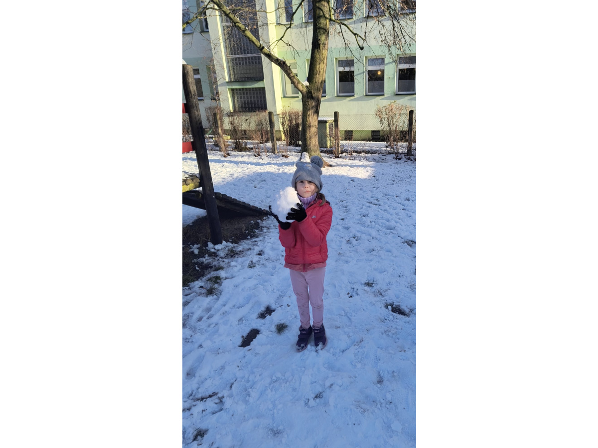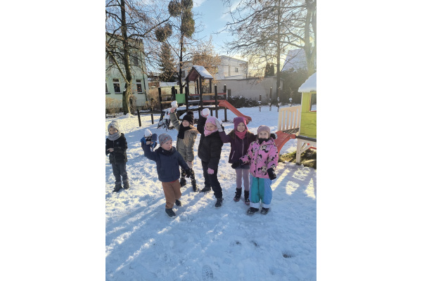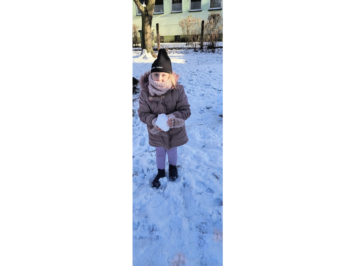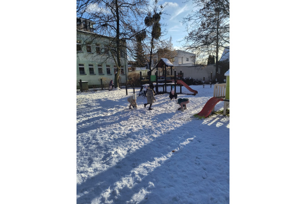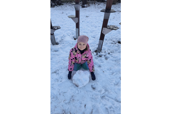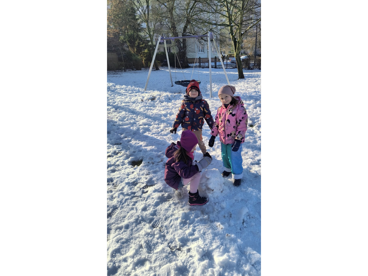Opady pierwszego śniegu wywołały u dzieci sporo radości. Ogród przedszkolny pokrył się warstwą śniegu więc przedszkolaki urządziły bitwę na śnieżki, ulepiły bałwana i robiły śniegowe orzełki.