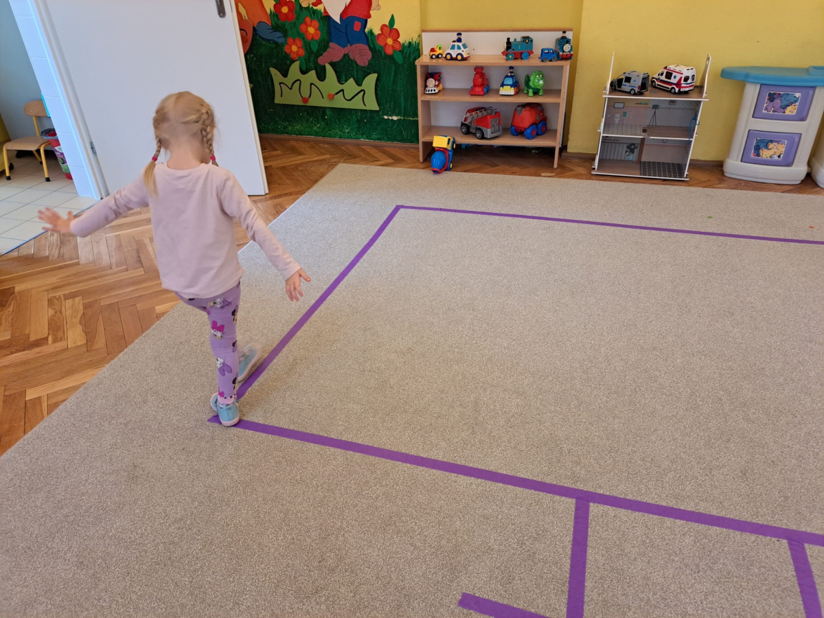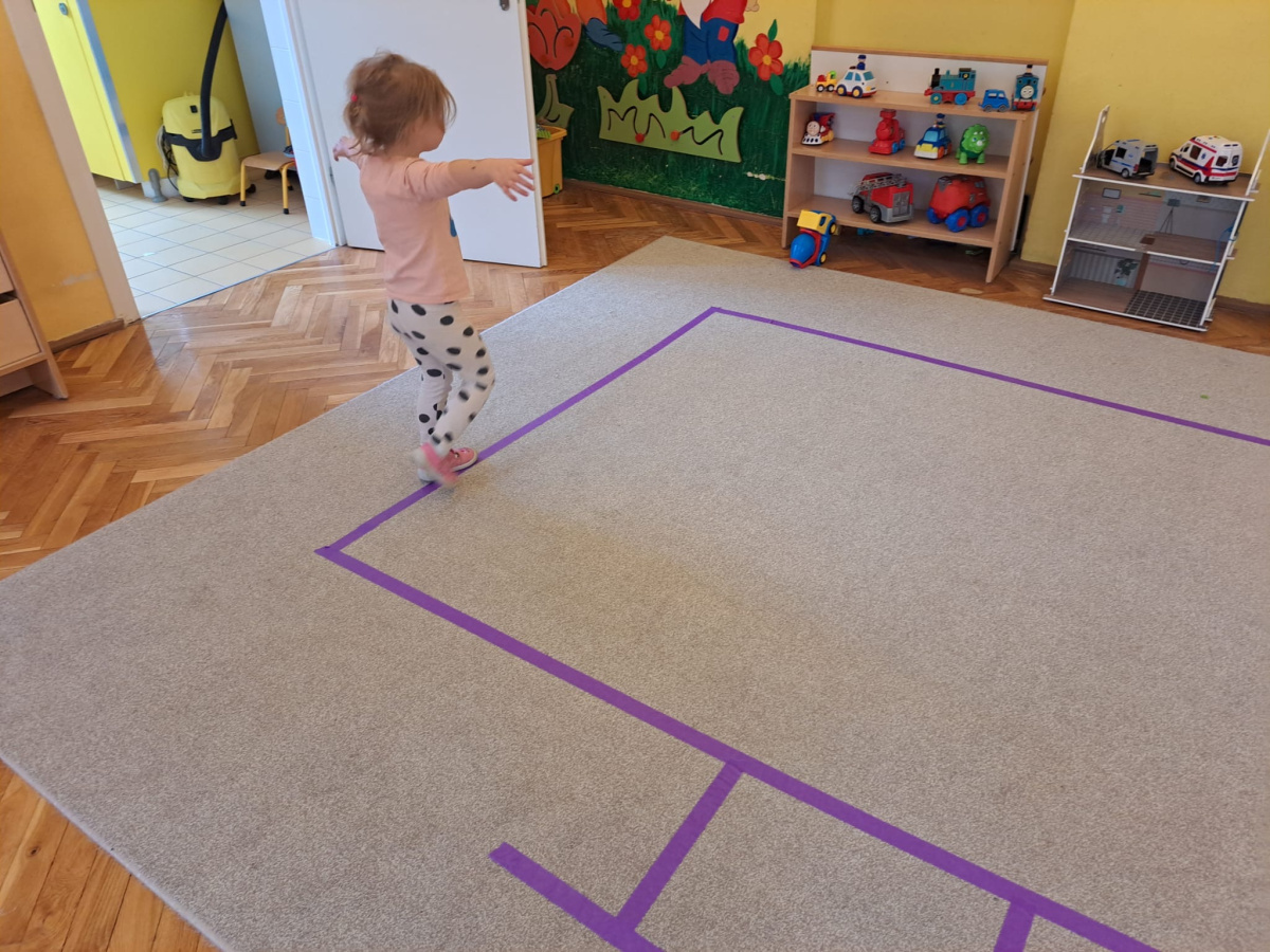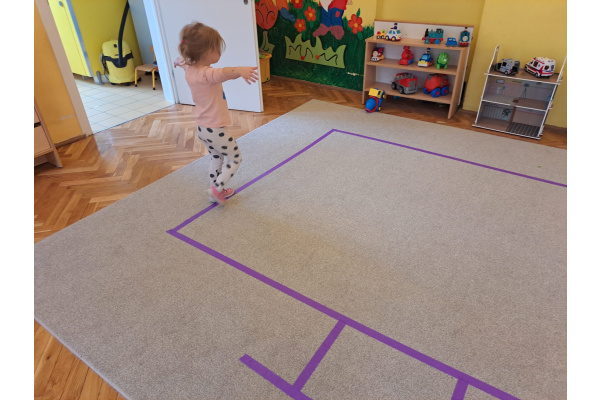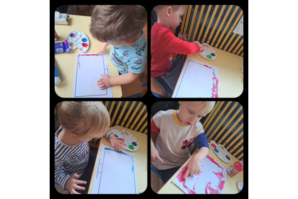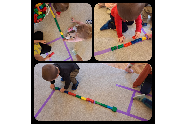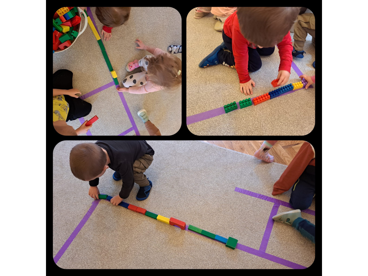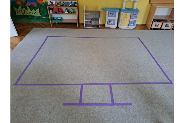 Podczas zajęć o wynalazkach dzieci z grupy I nie tylko poszerzały swoją wiedzę o świecie, ale także przygotowywały swoje ciało, rękę i oko do przyszłej nauki pisania. Na początku, na dużym formacie, oswajały się z kształtem – chodząc po taśmie malarskiej, która tworzyła ramę telewizora, ćwiczyły równowagę i koordynację ruchową. Następnie układały na niej klocki, rozwijając precyzję i koncentrację.