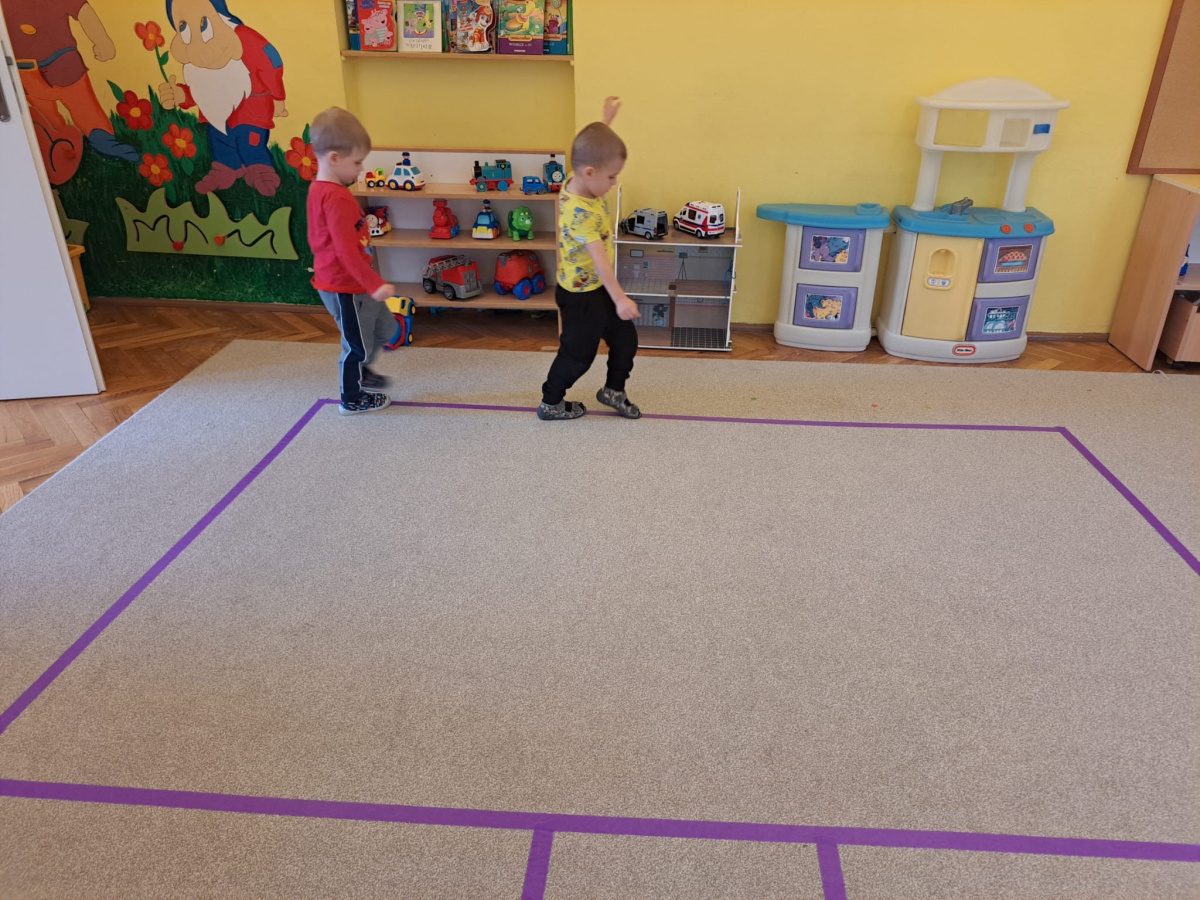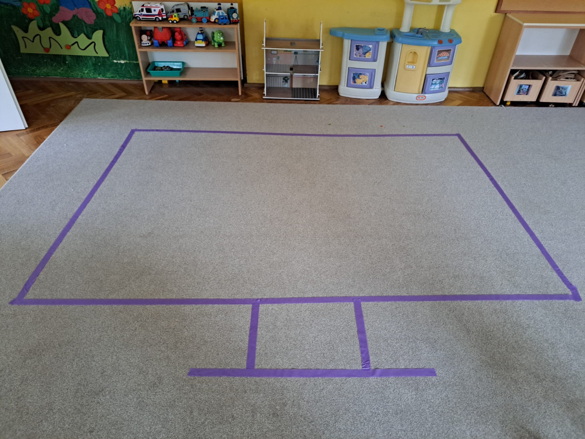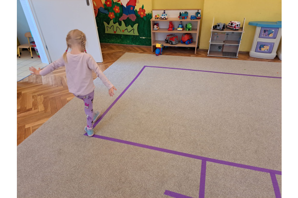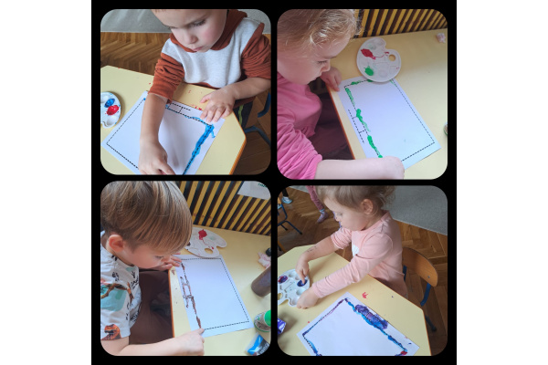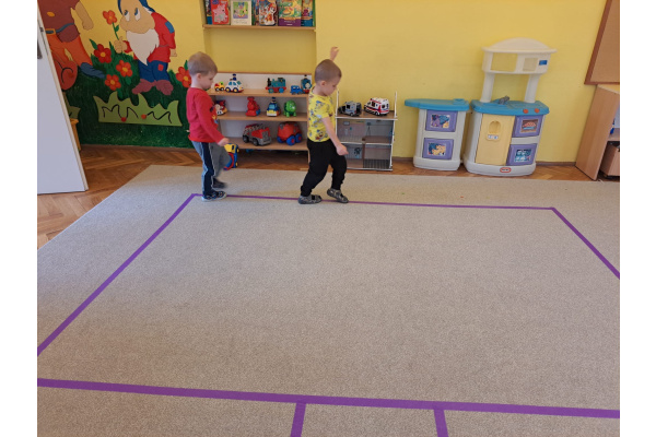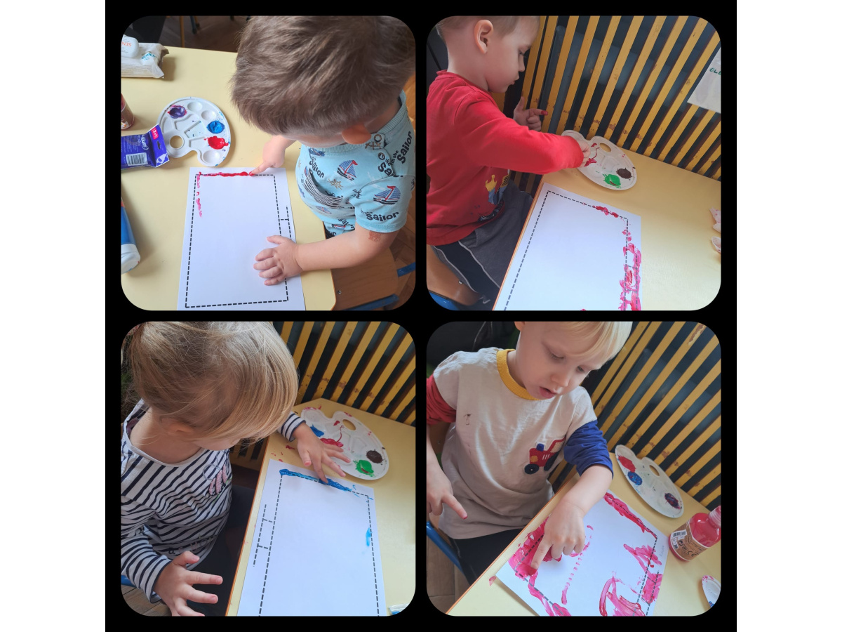 Podczas zajęć o wynalazkach dzieci z grupy I nie tylko poszerzały swoją wiedzę o świecie, ale także przygotowywały swoje ciało, rękę i oko do przyszłej nauki pisania. Na początku, na dużym formacie, oswajały się z kształtem – chodząc po taśmie malarskiej, która tworzyła ramę telewizora, ćwiczyły równowagę i koordynację ruchową. Następnie układały na niej klocki, rozwijając precyzję i koncentrację.