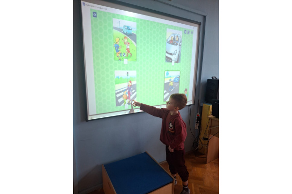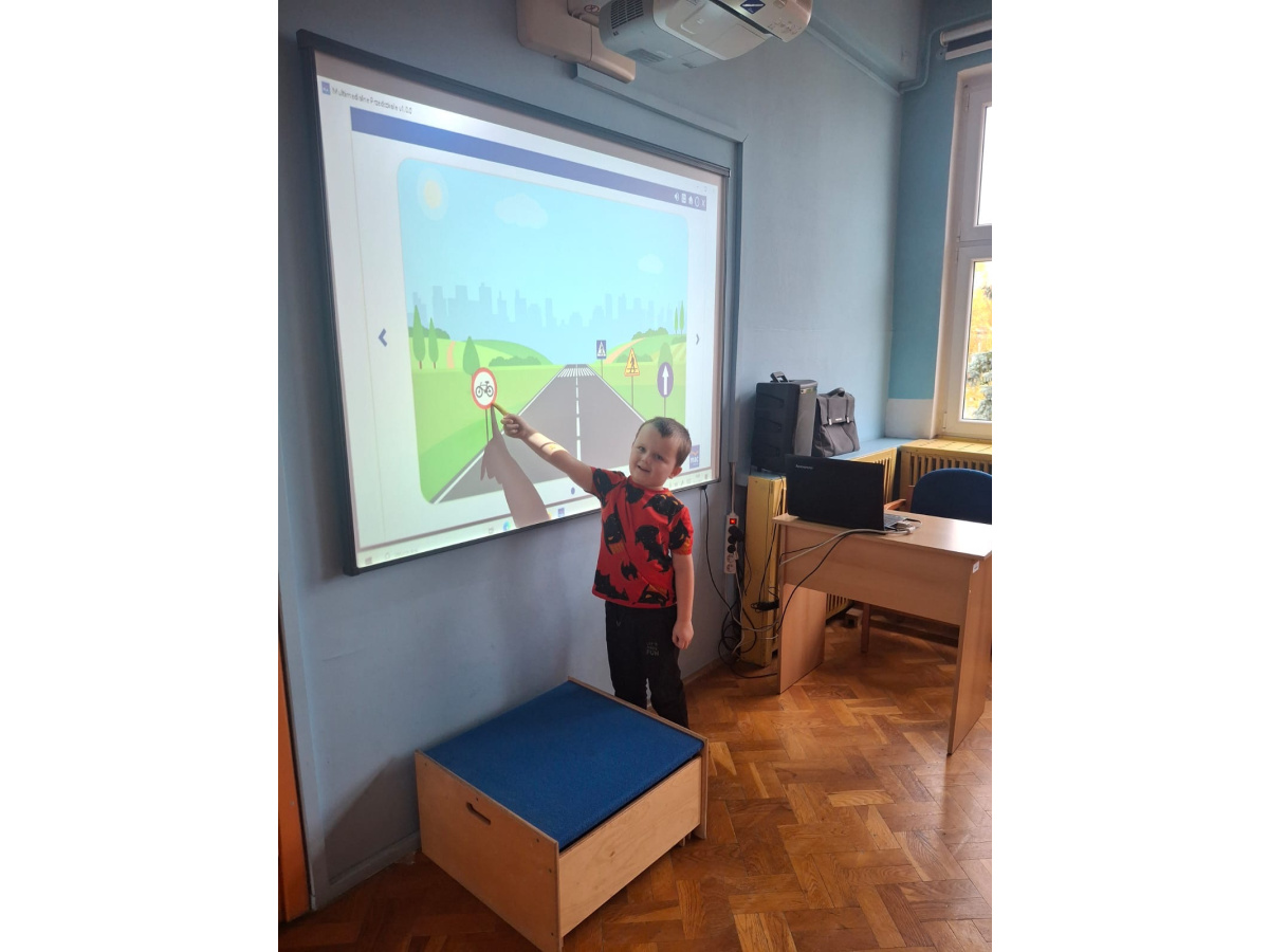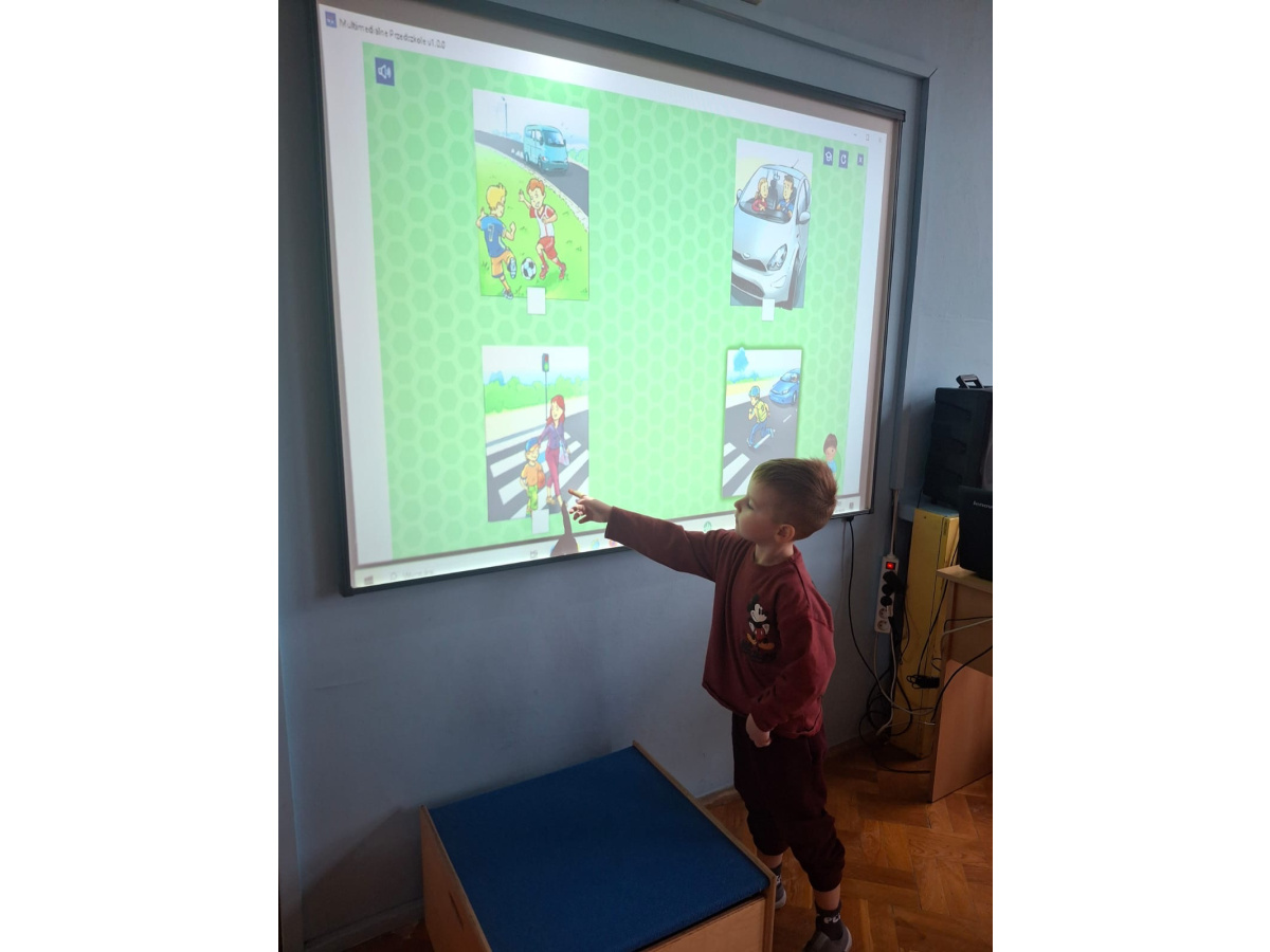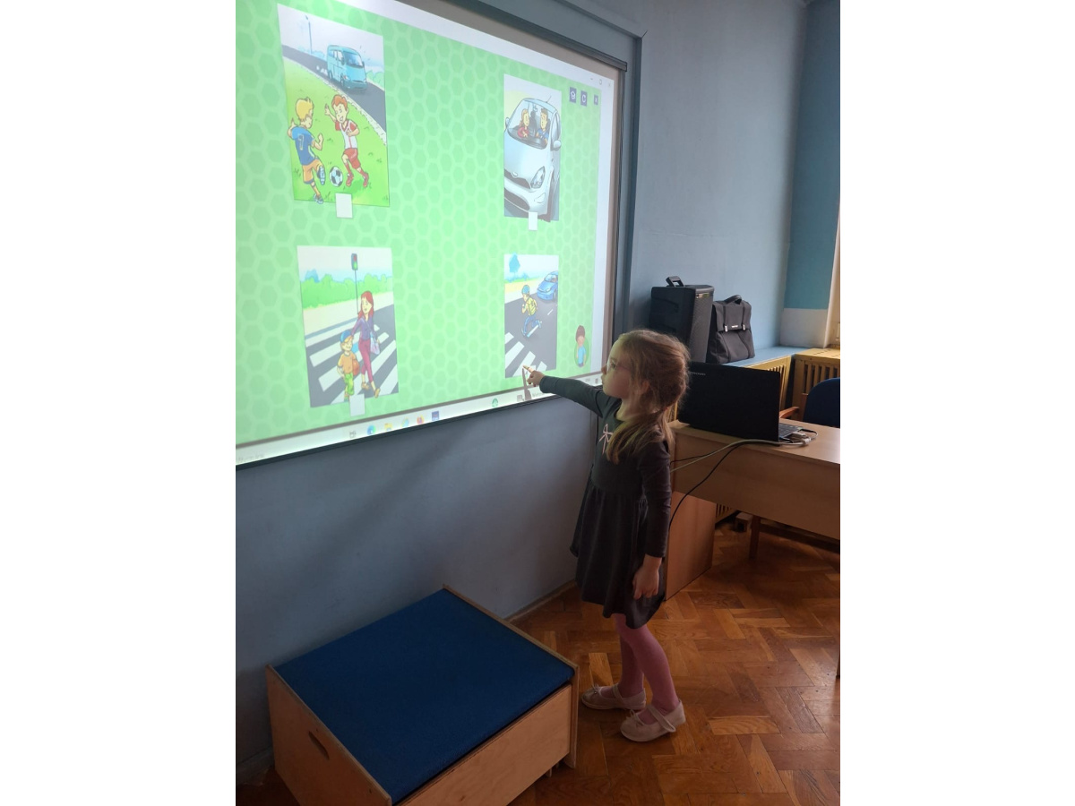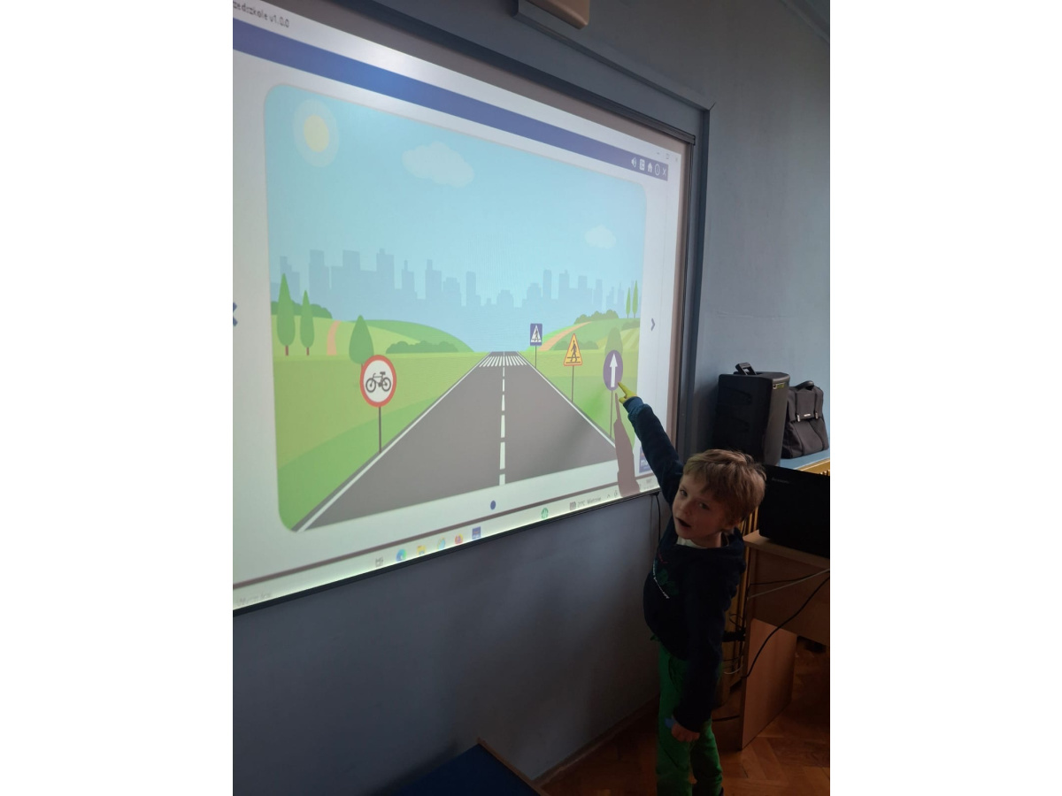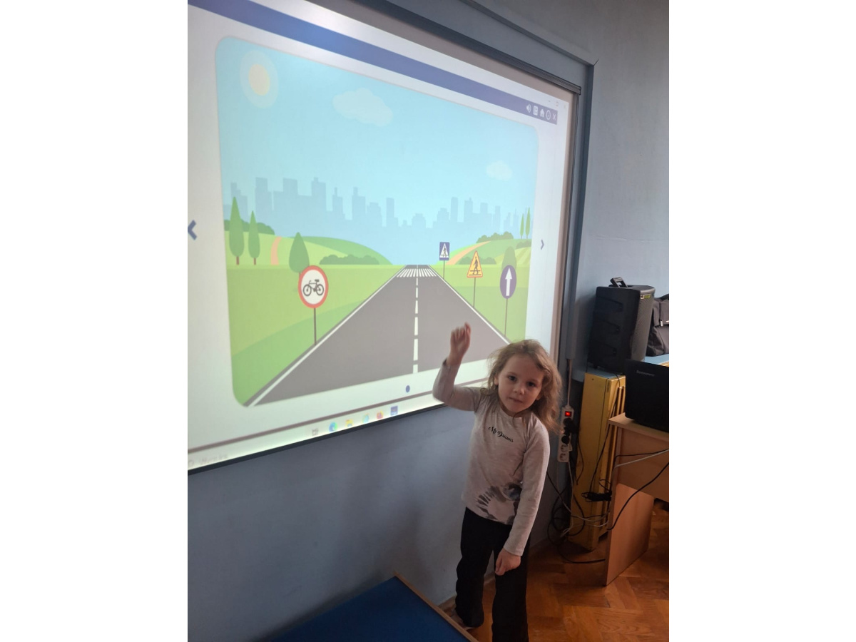 "Poznajemy zasady ruchu drogowego "-zajęcia z tablicą multimedialną w Gr.V Dzieci z Gr.Sówek poznawały zasady ruchu drogowego-wykonywały różne zadania, które pomagały utrwalić, jaj należy bezpiecznie poruszać się po ulicy .