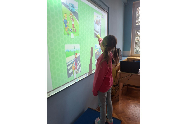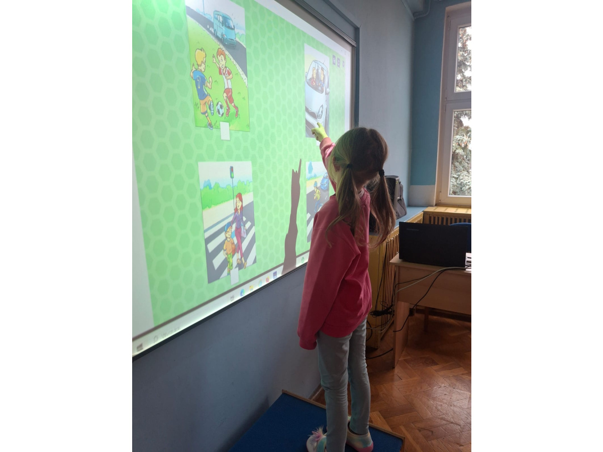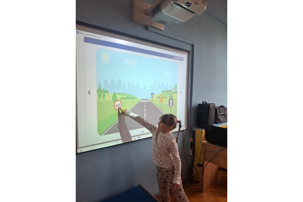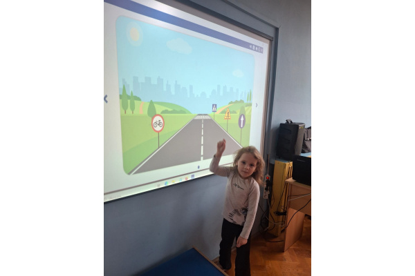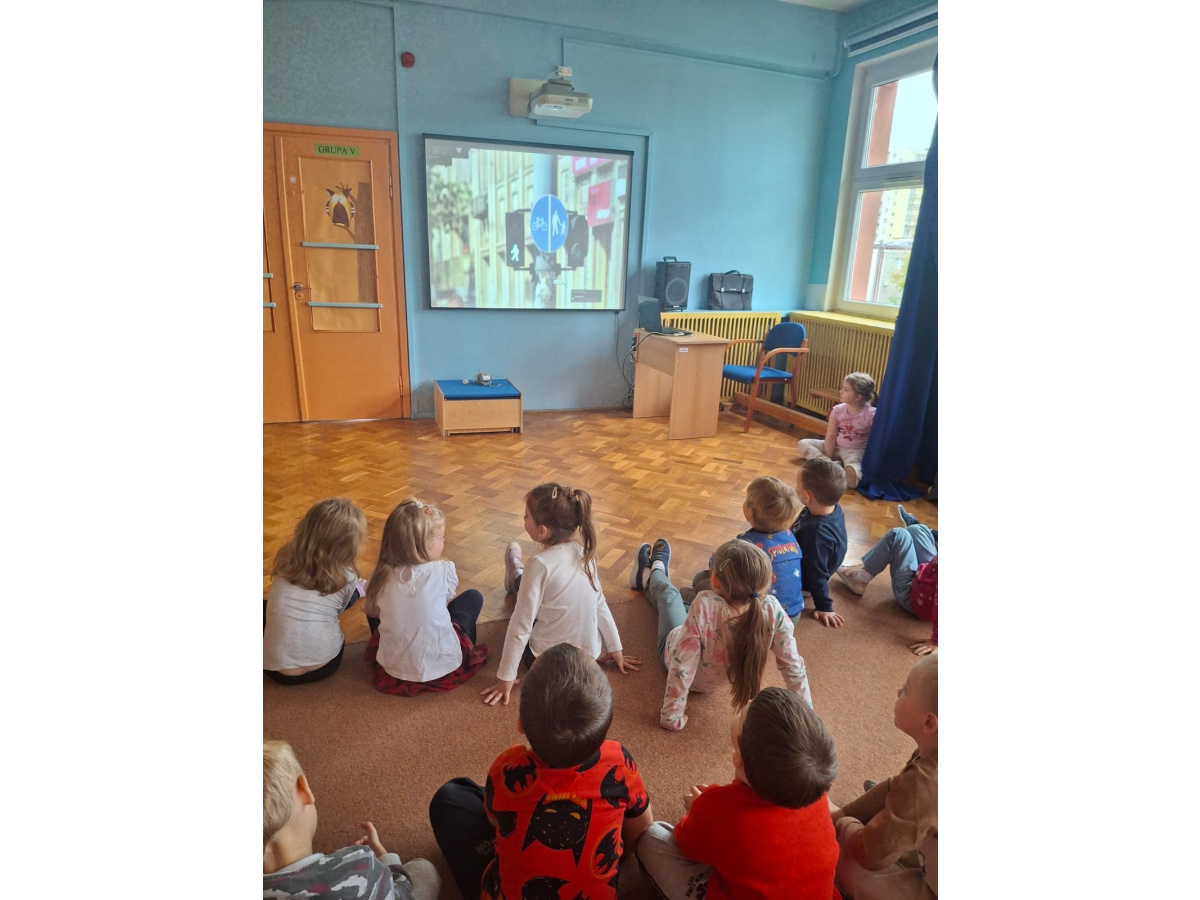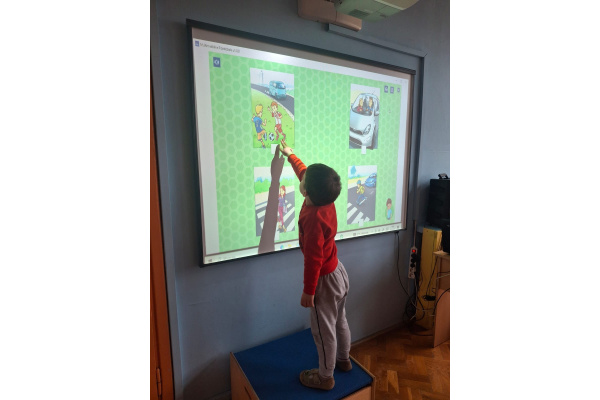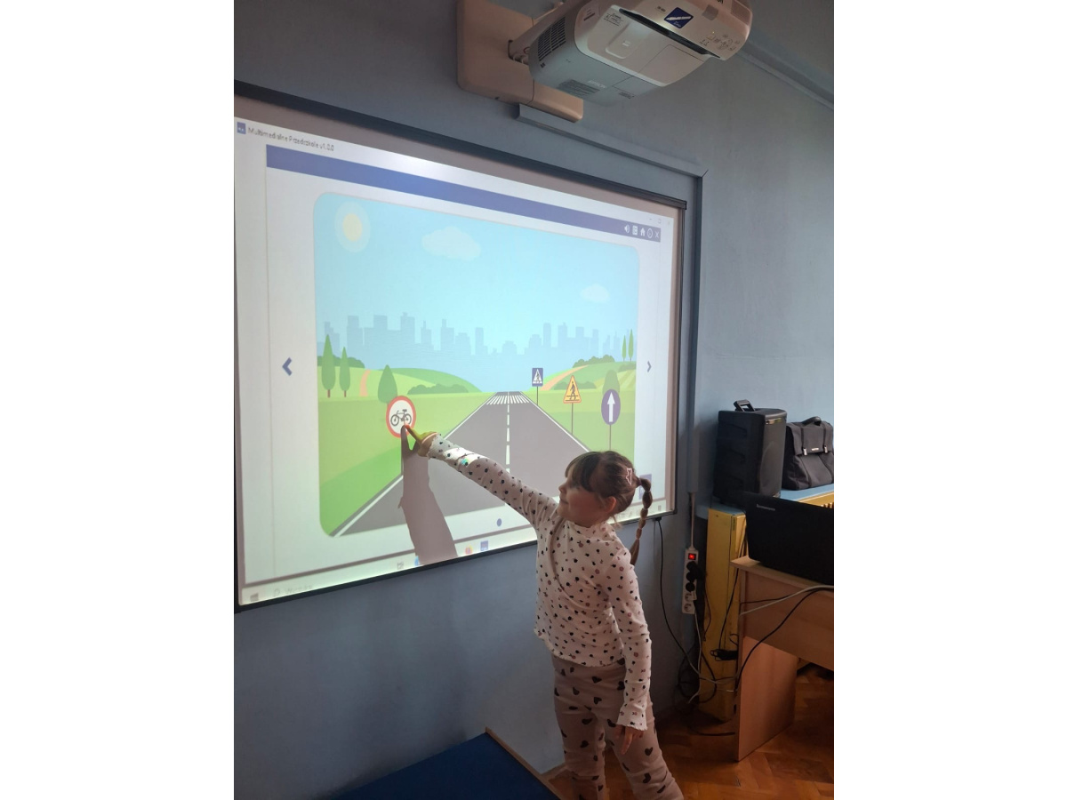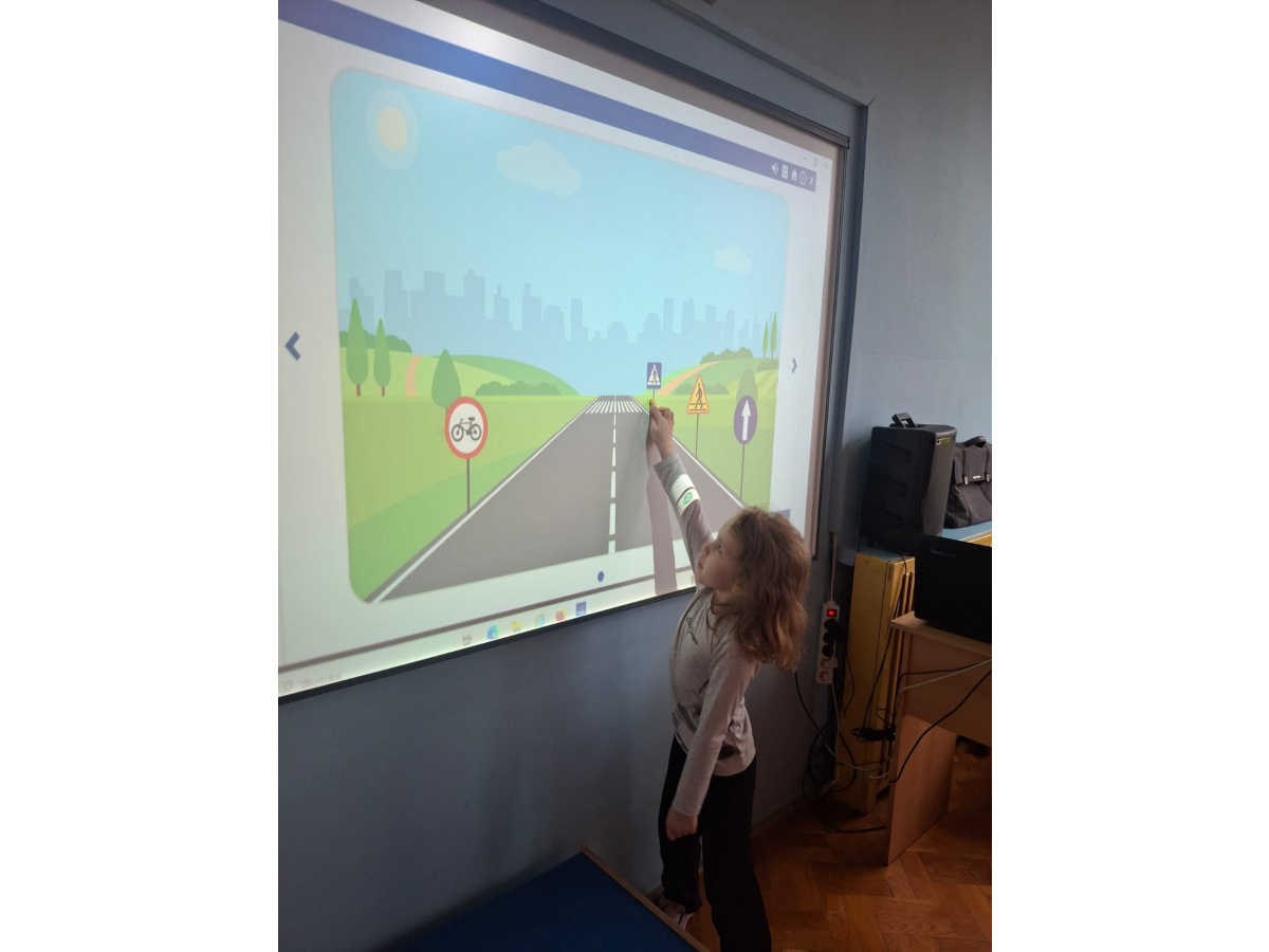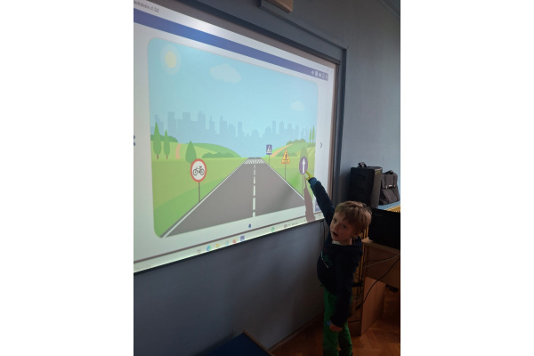"Poznajemy zasady ruchu drogowego "-zajęcia z tablicą multimedialną w Gr.V Dzieci z Gr.Sówek poznawały zasady ruchu drogowego-wykonywały różne zadania, które pomagały utrwalić, jaj należy bezpiecznie poruszać się po ulicy .
