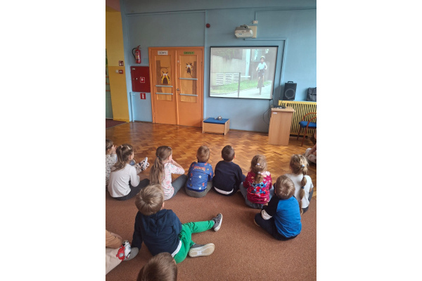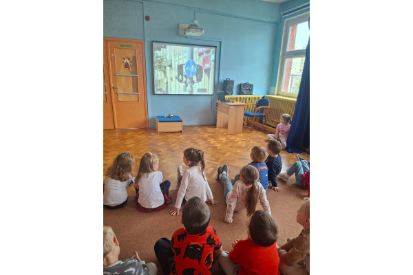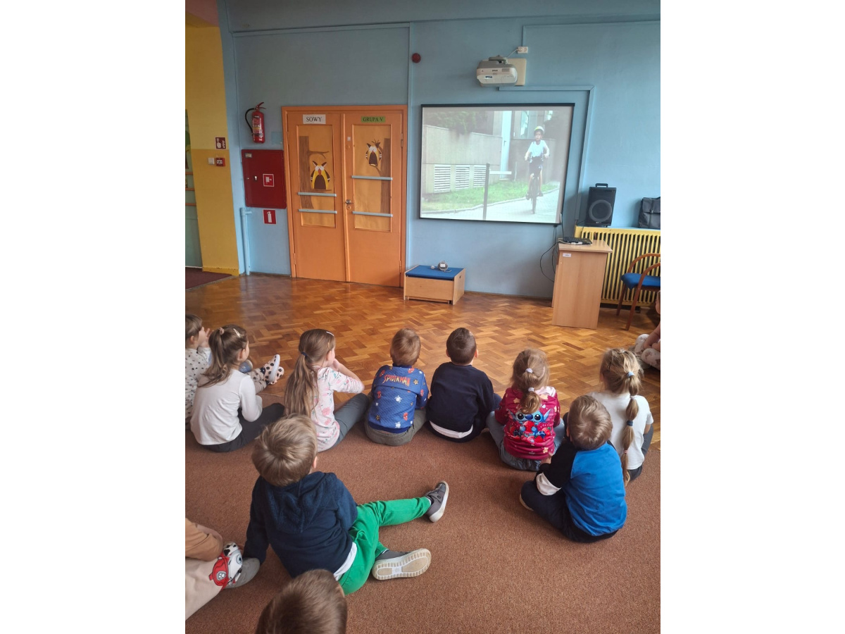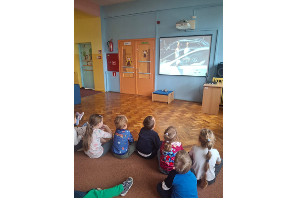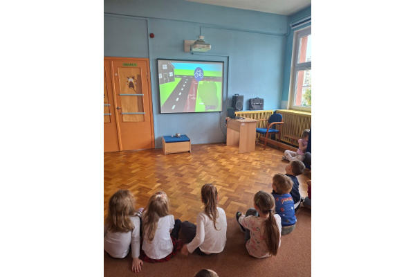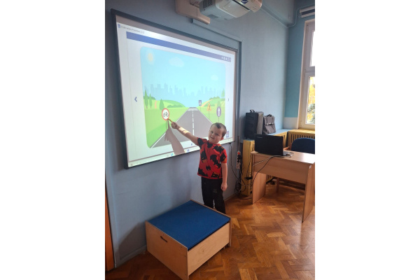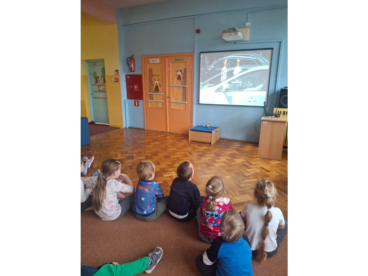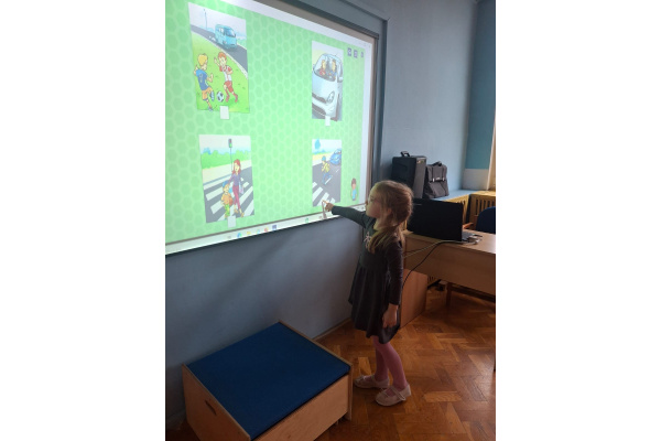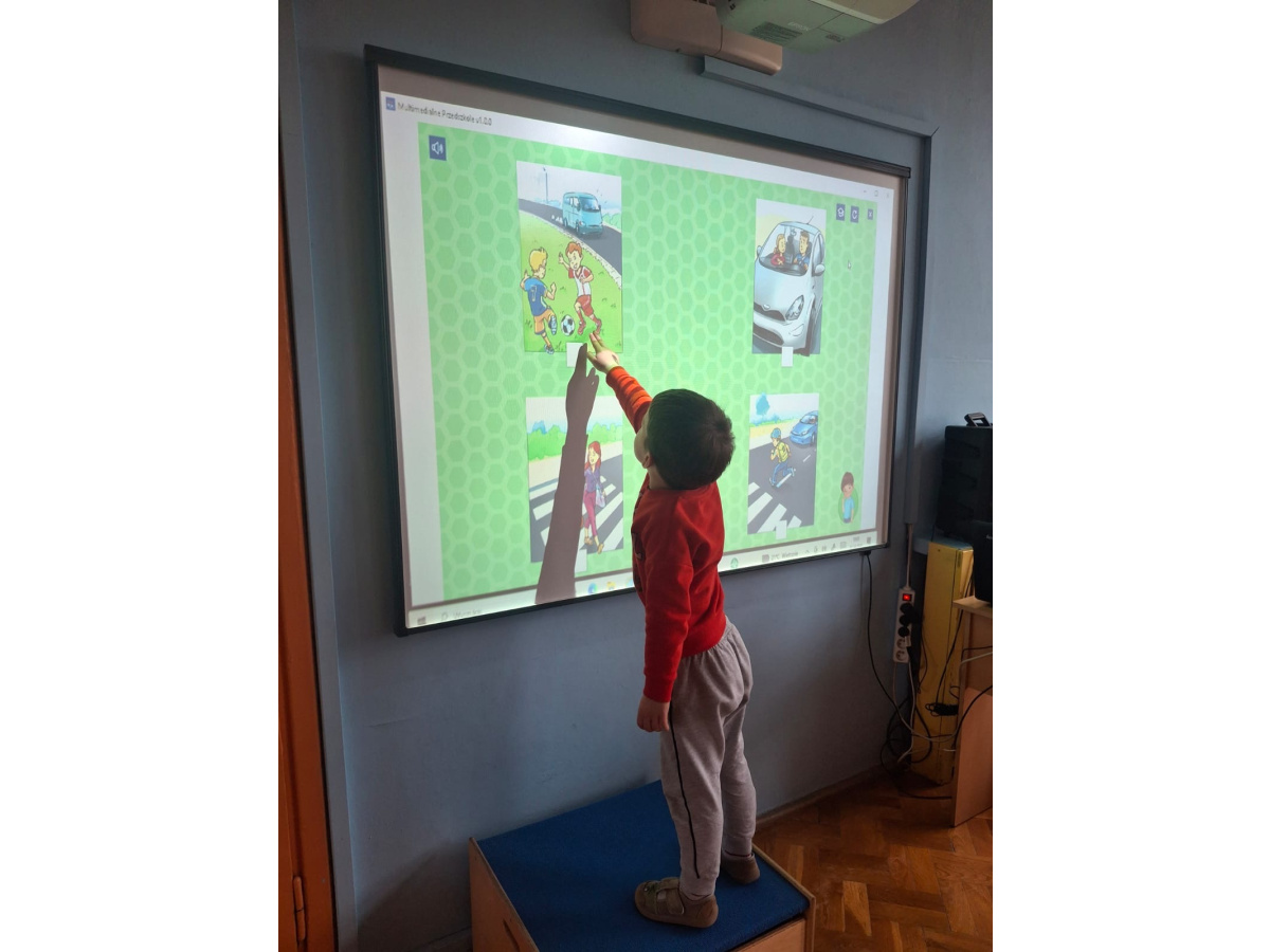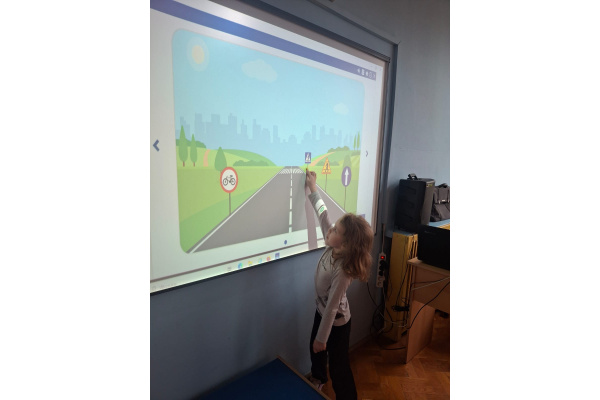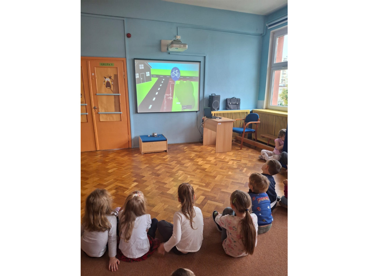 "Poznajemy zasady ruchu drogowego "-zajęcia z tablicą multimedialną w Gr.V Dzieci z Gr.Sówek poznawały zasady ruchu drogowego-wykonywały różne zadania, które pomagały utrwalić, jaj należy bezpiecznie poruszać się po ulicy .