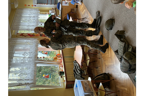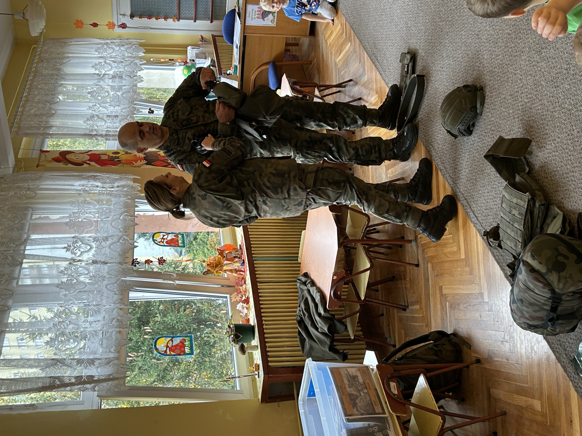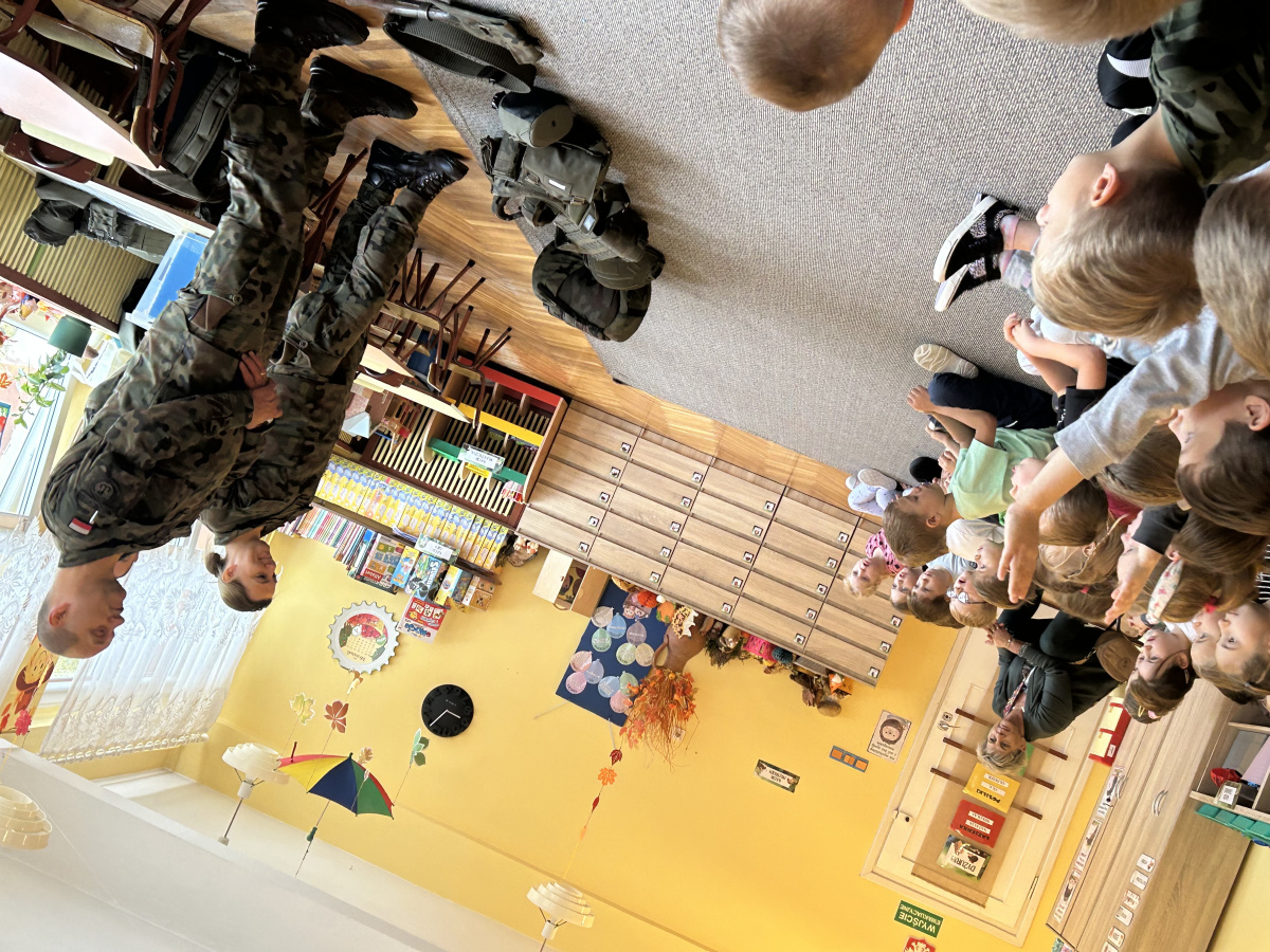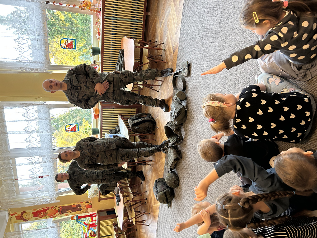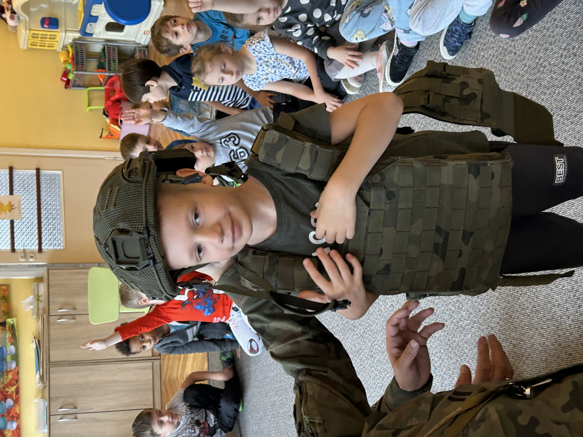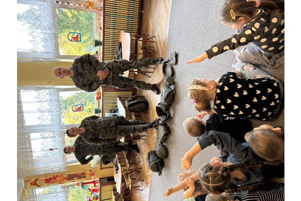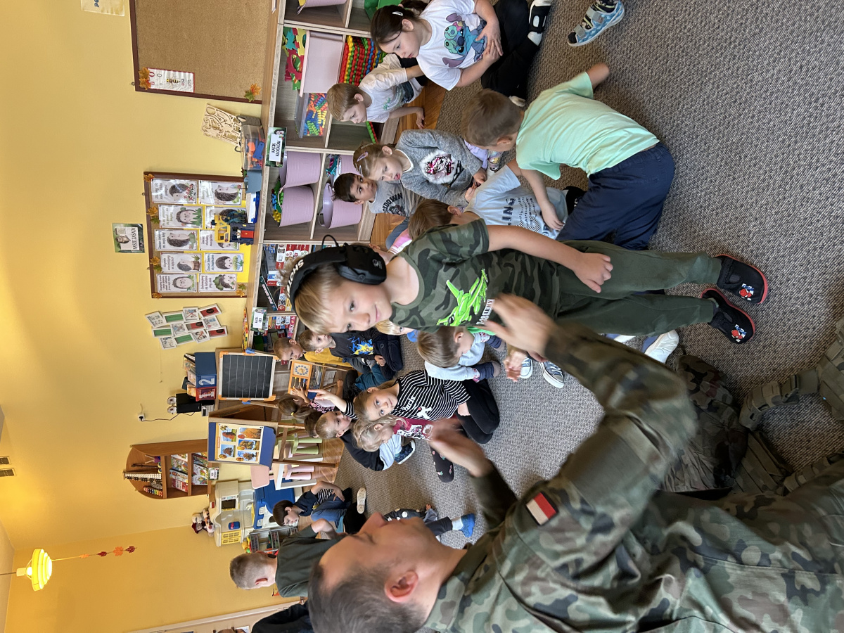 Dziś w naszym przedszkolu gościli żołnierze z 8 Kujawsko-Pomorskiej Brygady Wojsk Terytorialnych. Podczas spotkania z nimi dzieci z grupy IV i VI dowiedziały się na czym polega praca żołnierza, jak wygląda jego mundur, oraz jakie dodatkowe wyposażenie posiada żołnierz. Przedszkolaki zobaczyły także samochód wojskowy.