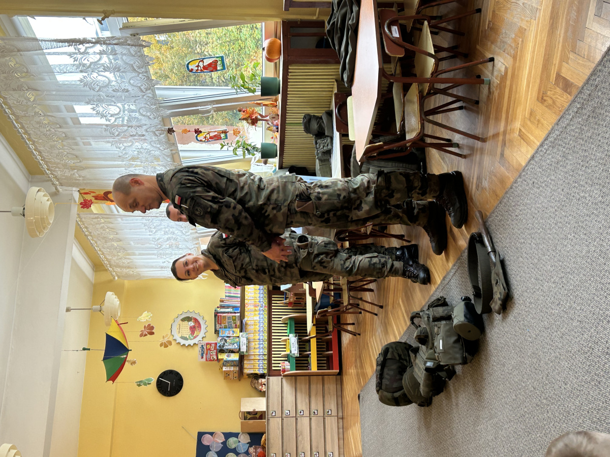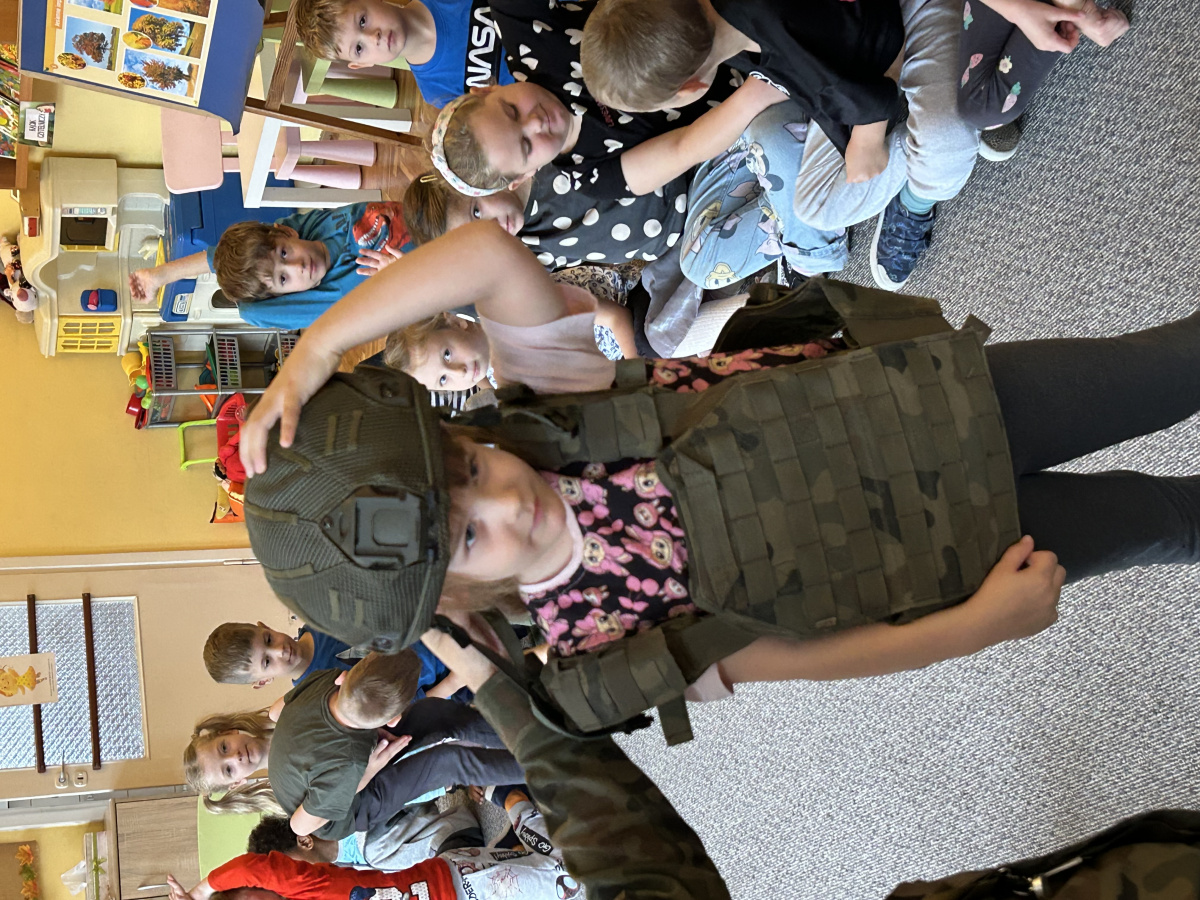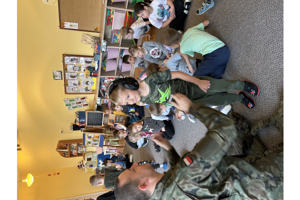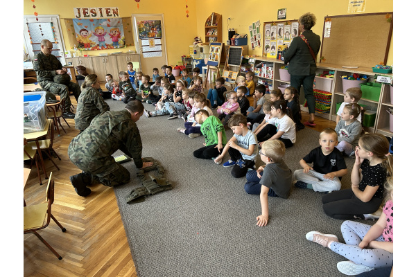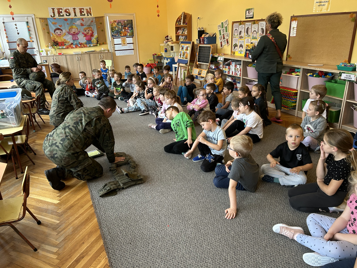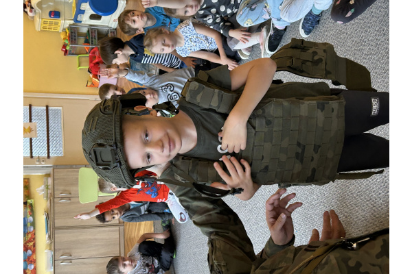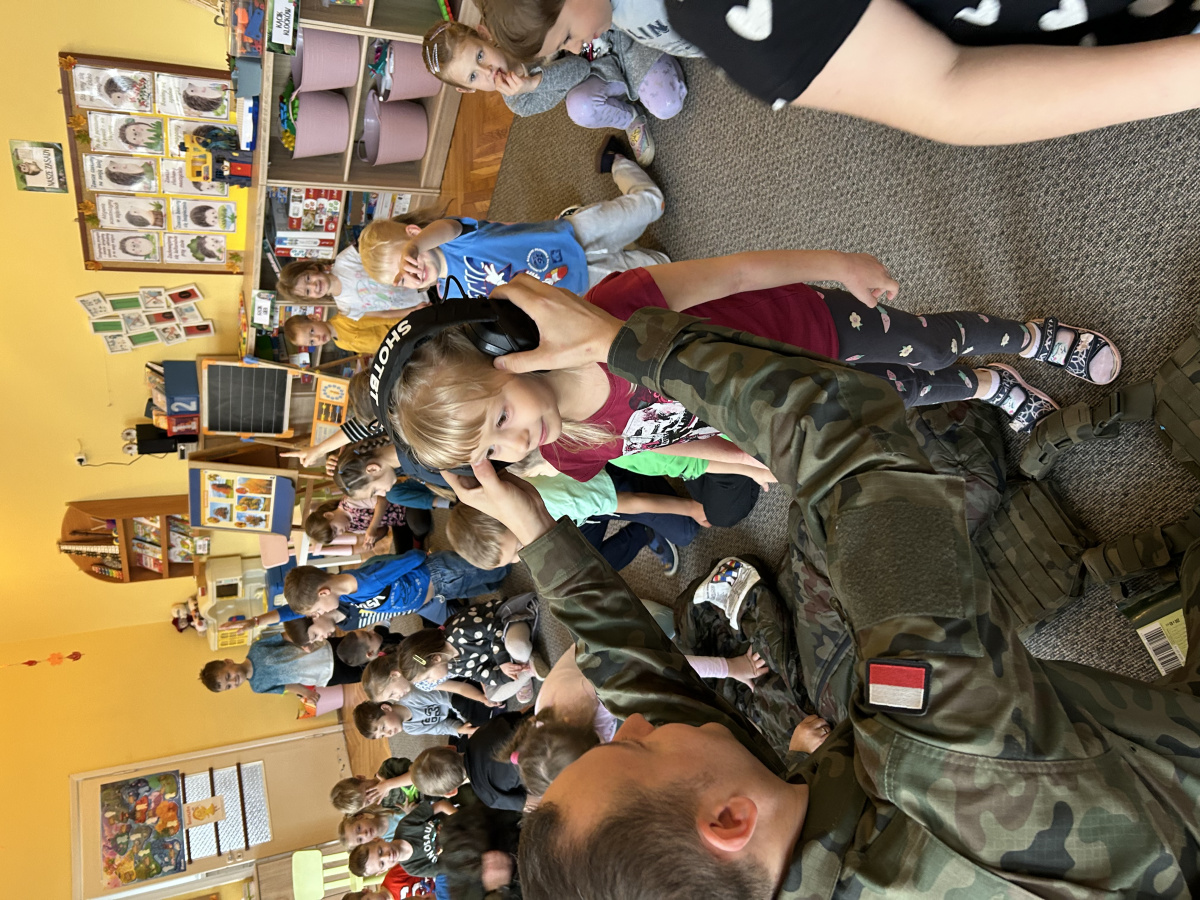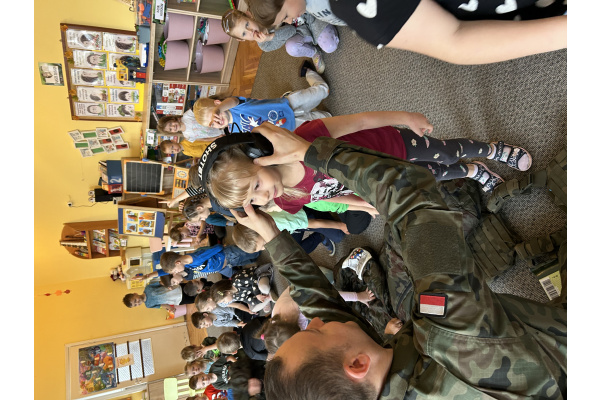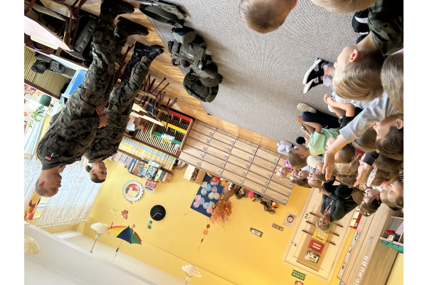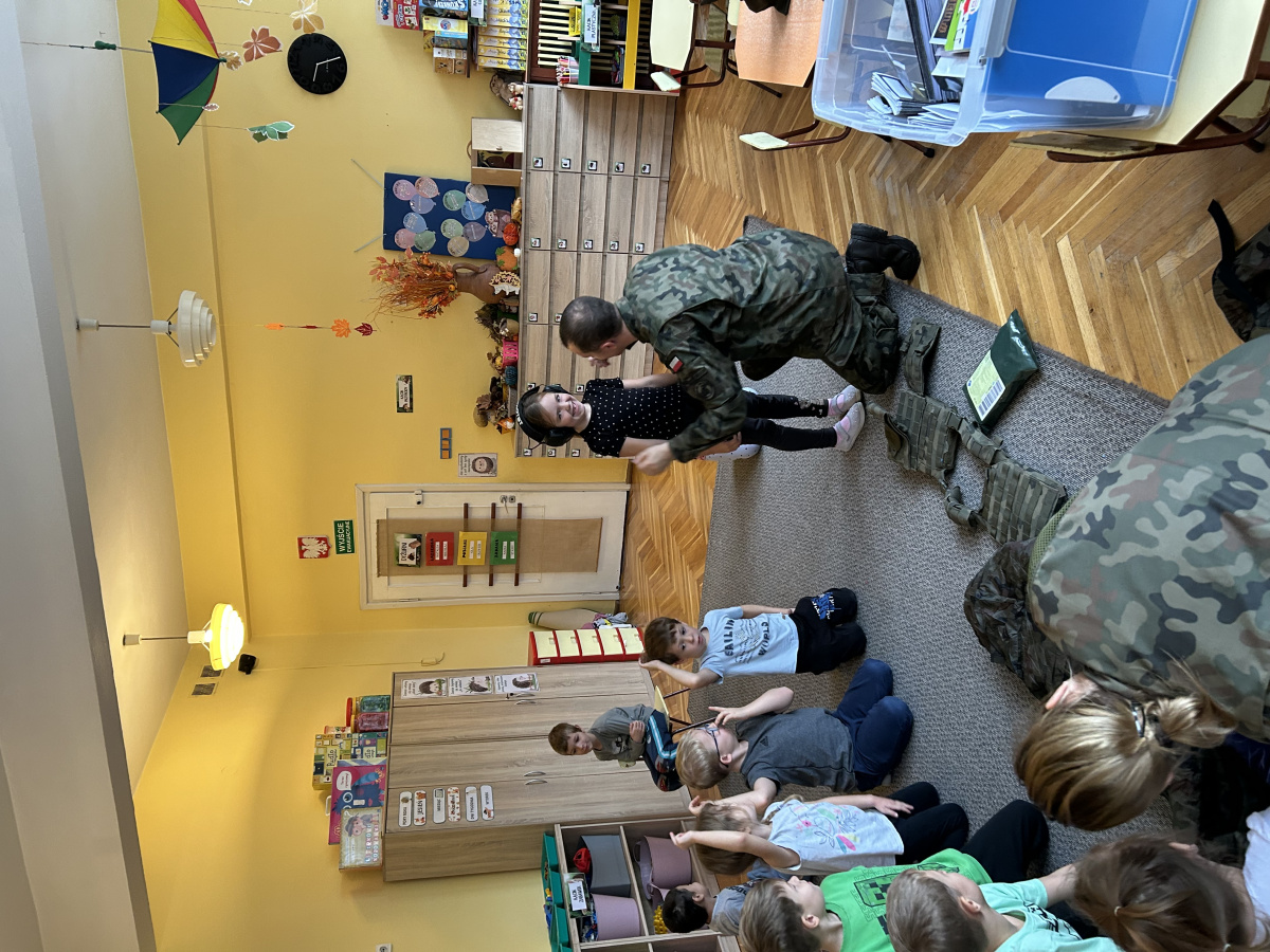 Dziś w naszym przedszkolu gościli żołnierze z 8 Kujawsko-Pomorskiej Brygady Wojsk Terytorialnych. Podczas spotkania z nimi dzieci z grupy IV i VI dowiedziały się na czym polega praca żołnierza, jak wygląda jego mundur, oraz jakie dodatkowe wyposażenie posiada żołnierz. Przedszkolaki zobaczyły także samochód wojskowy.