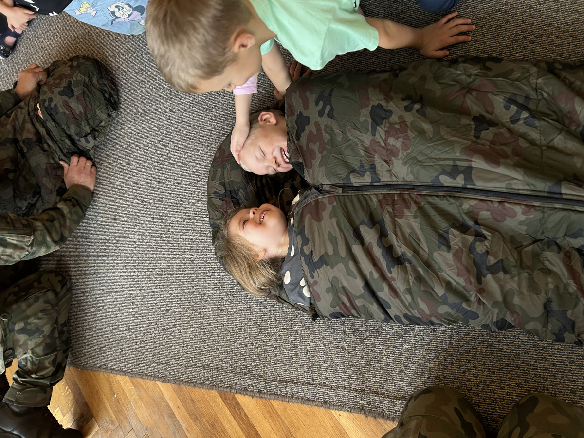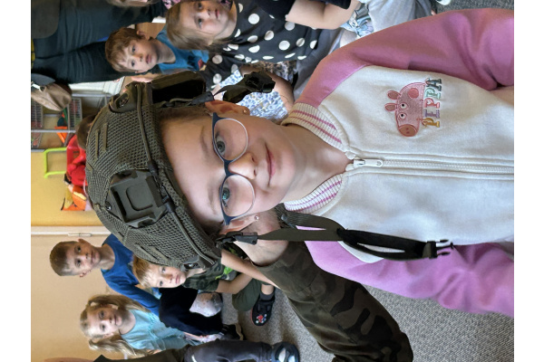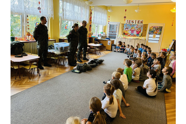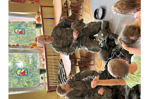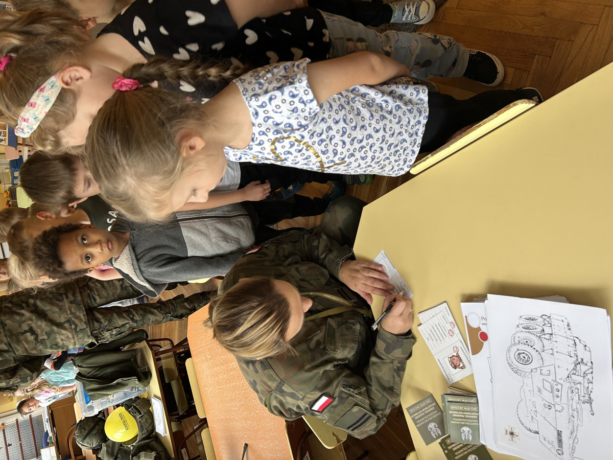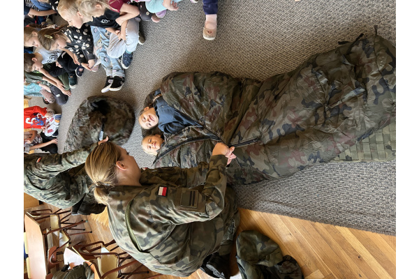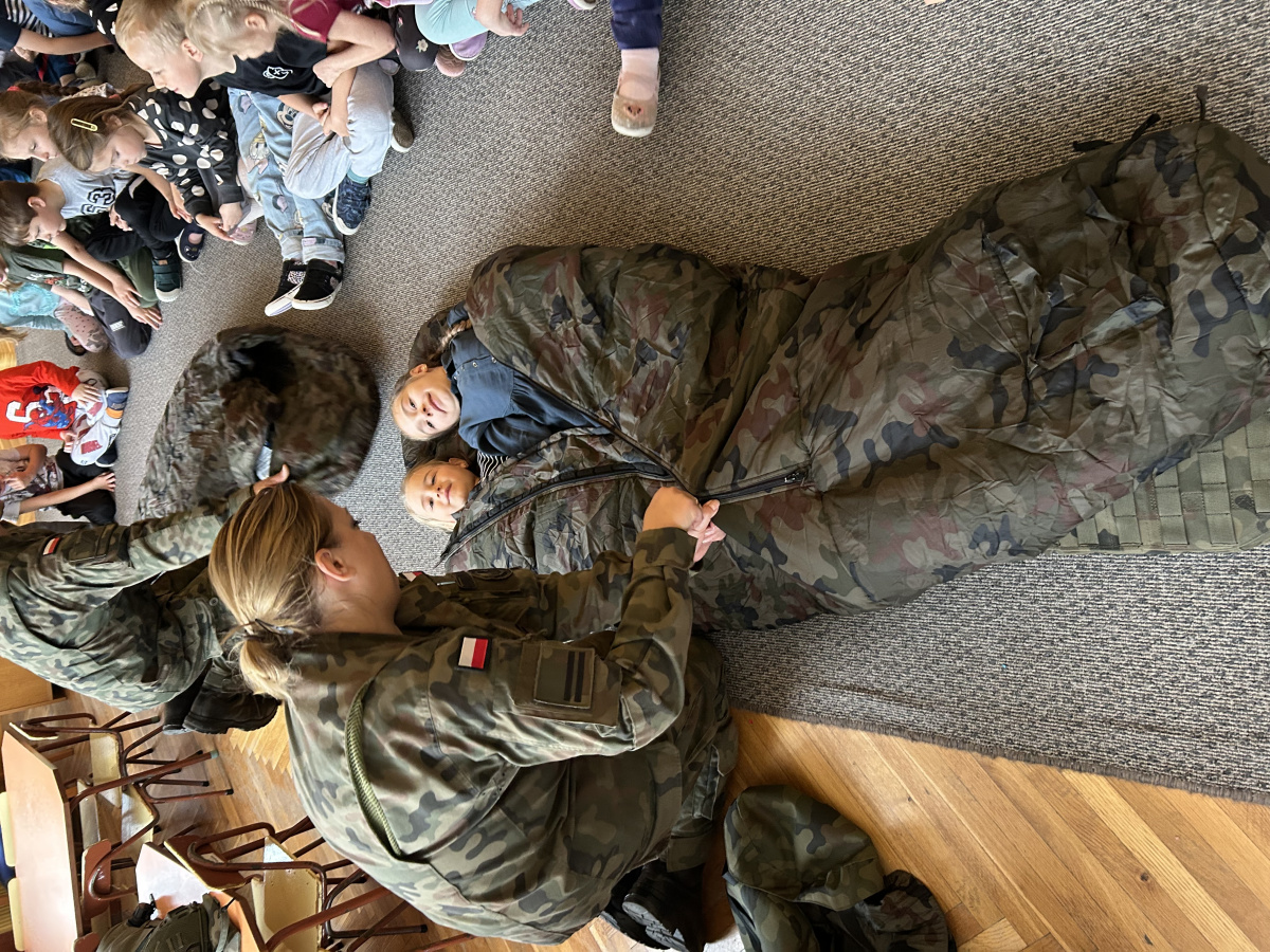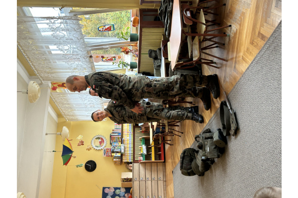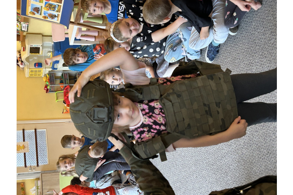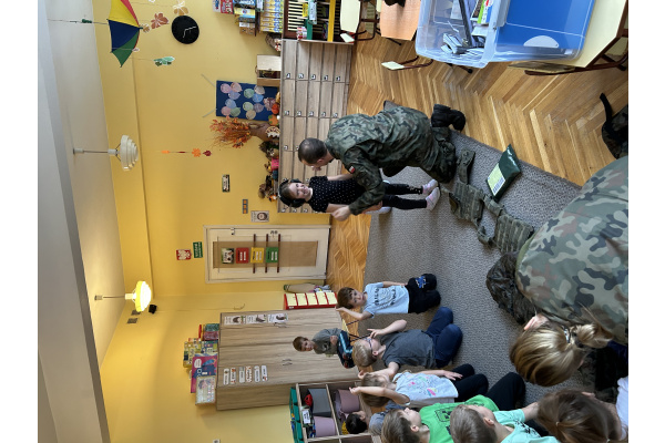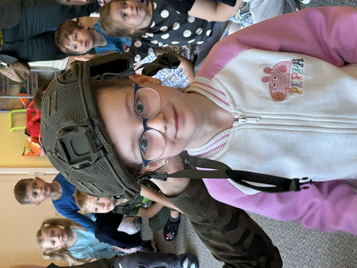 Dziś w naszym przedszkolu gościli żołnierze z 8 Kujawsko-Pomorskiej Brygady Wojsk Terytorialnych. Podczas spotkania z nimi dzieci z grupy IV i VI dowiedziały się na czym polega praca żołnierza, jak wygląda jego mundur, oraz jakie dodatkowe wyposażenie posiada żołnierz. Przedszkolaki zobaczyły także samochód wojskowy.