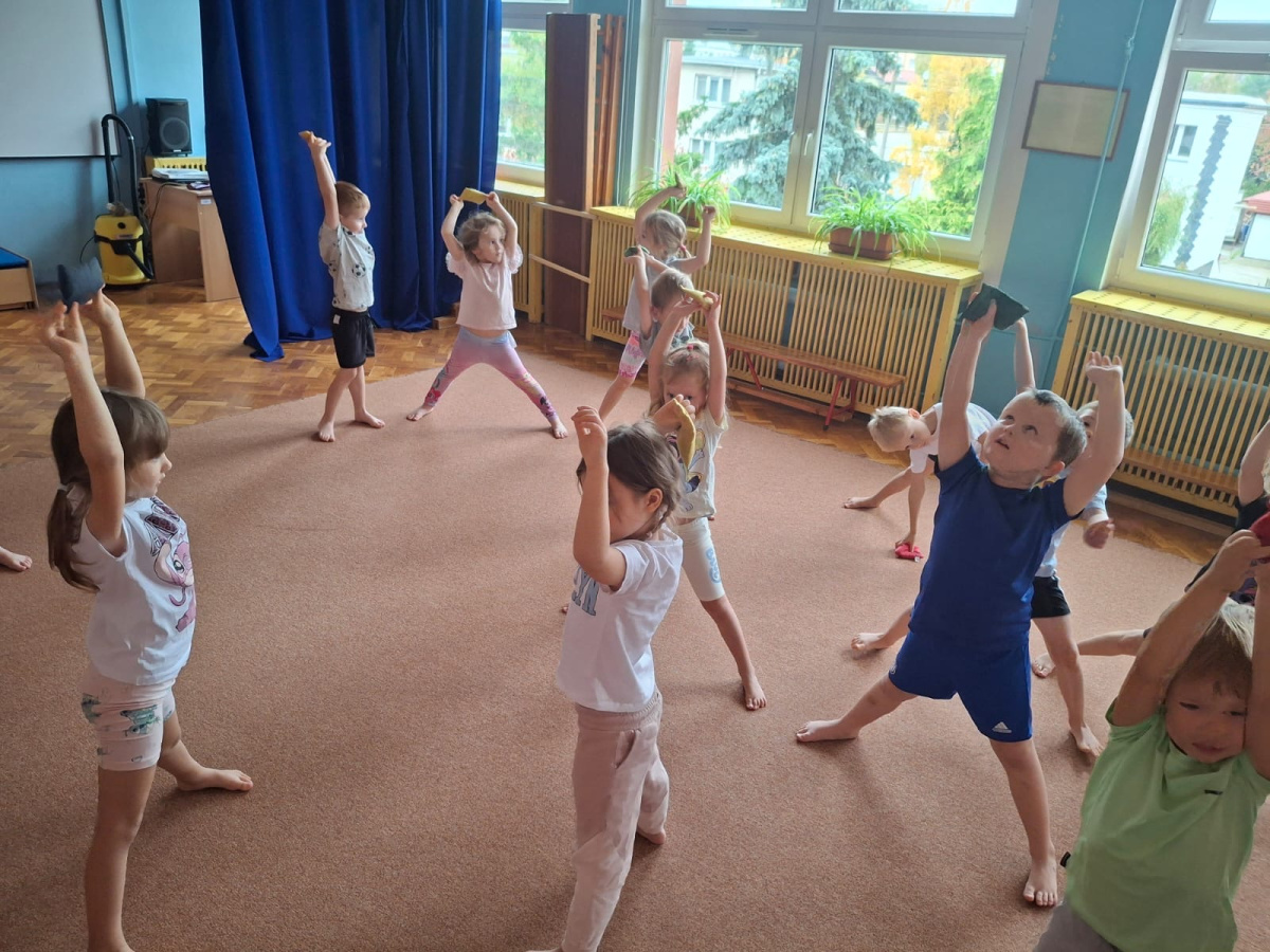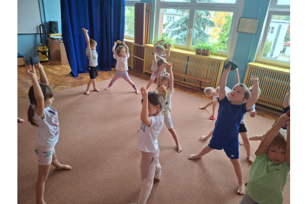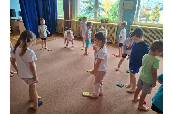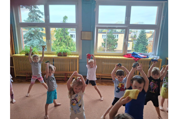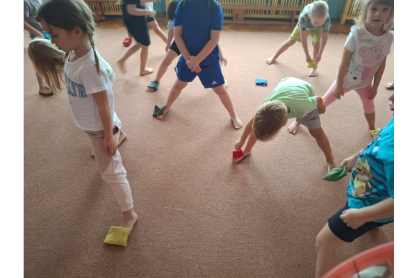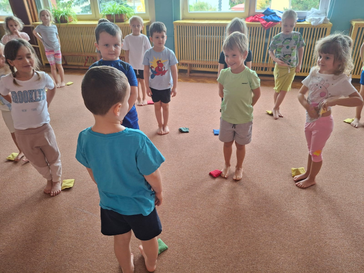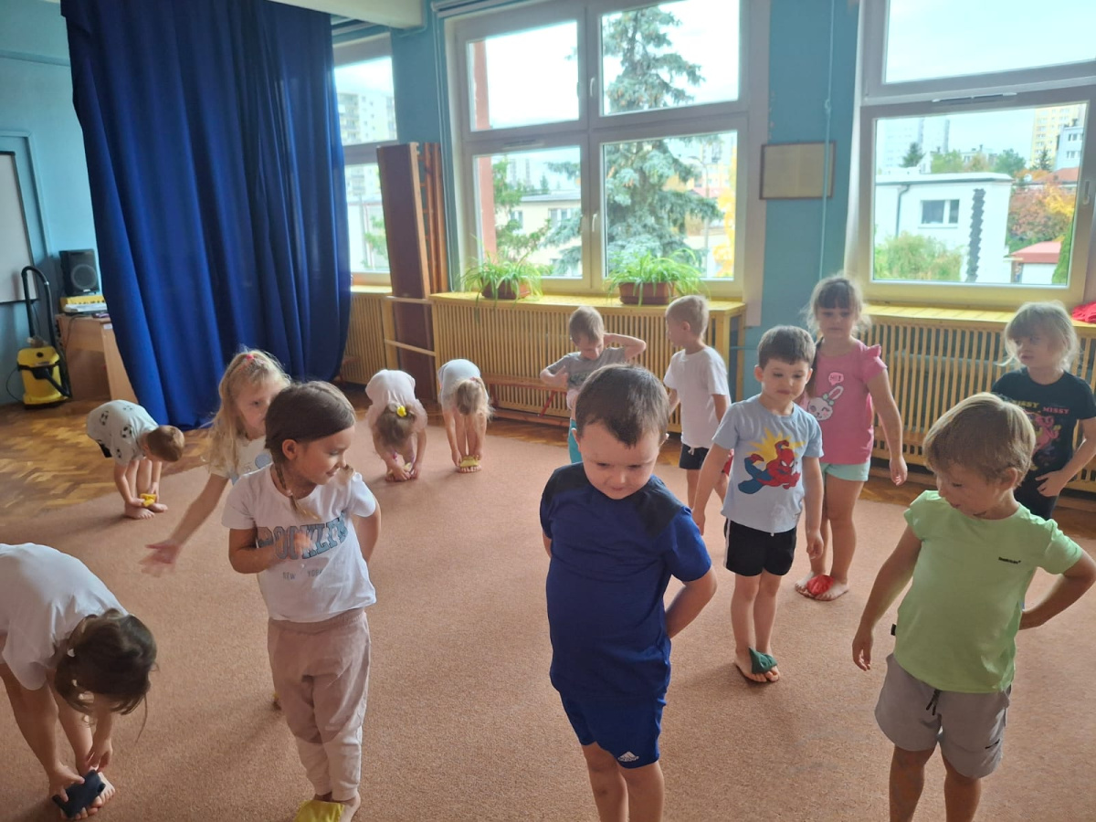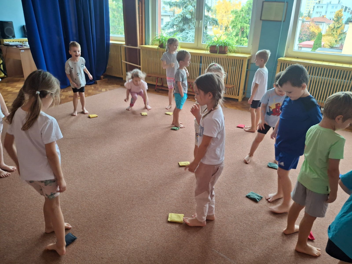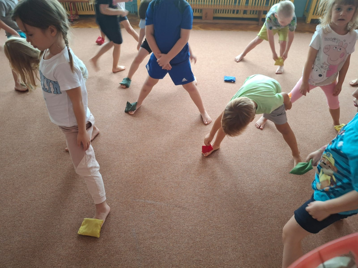 "Zestaw ćwiczeń gimnastycznych w Gr.V"- Po wakacjach dzieci z Gr.Sówek ćwiczą w strojach gimnastycznych na zajęciach. W czwartek ćwiczyły z woreczkami i utrwalały orientację w schemacie własnego ciała.