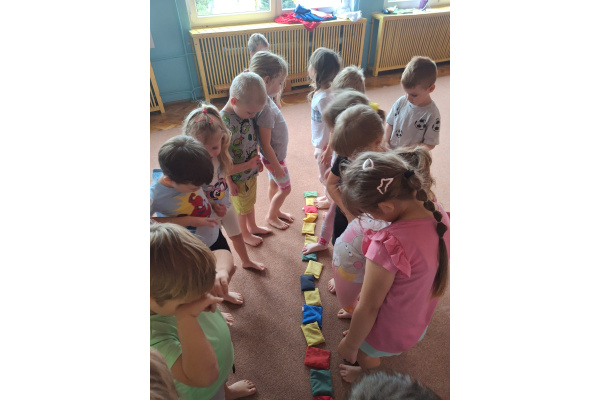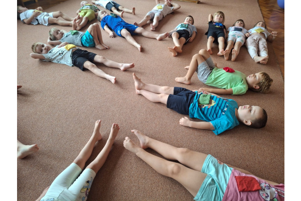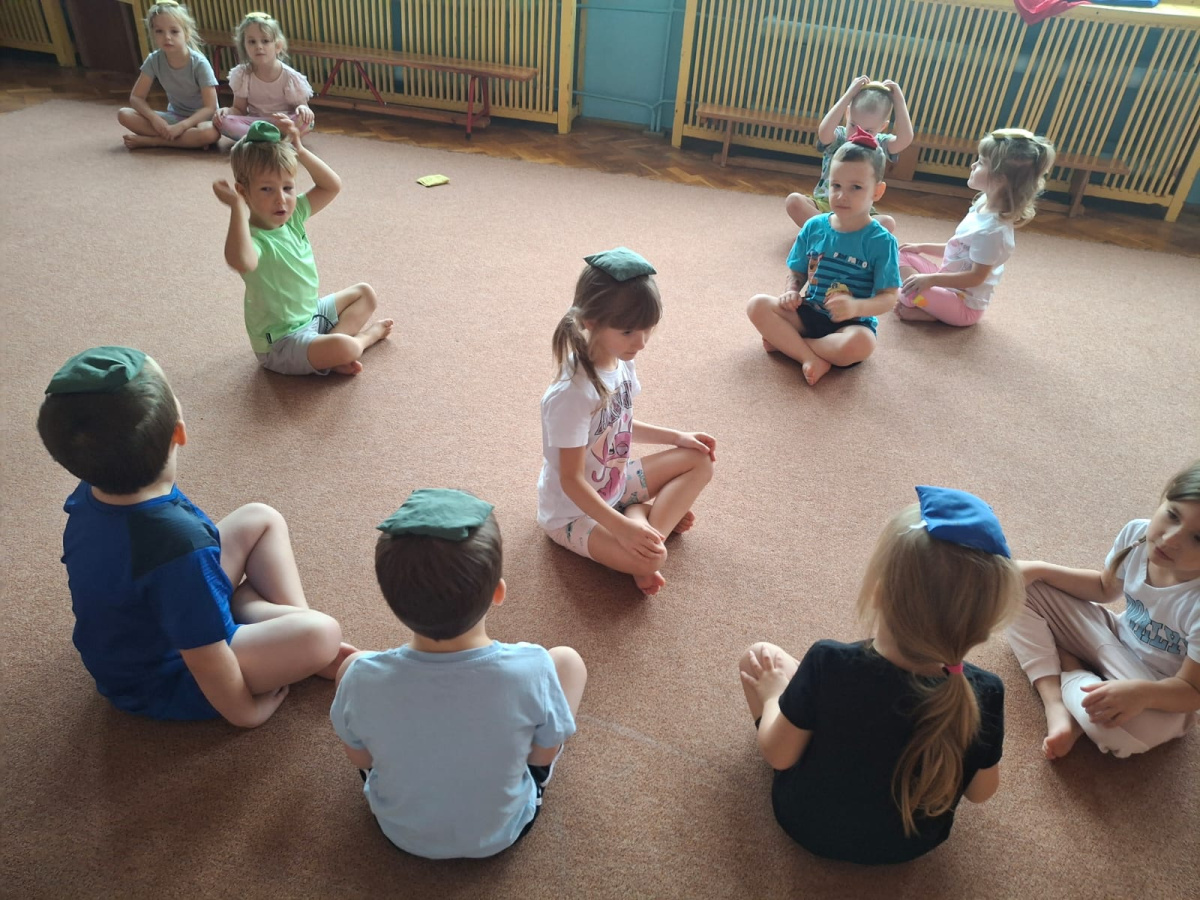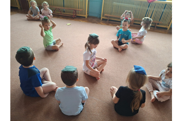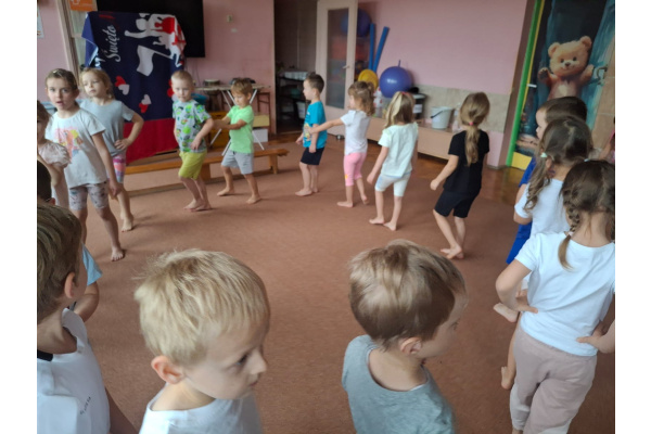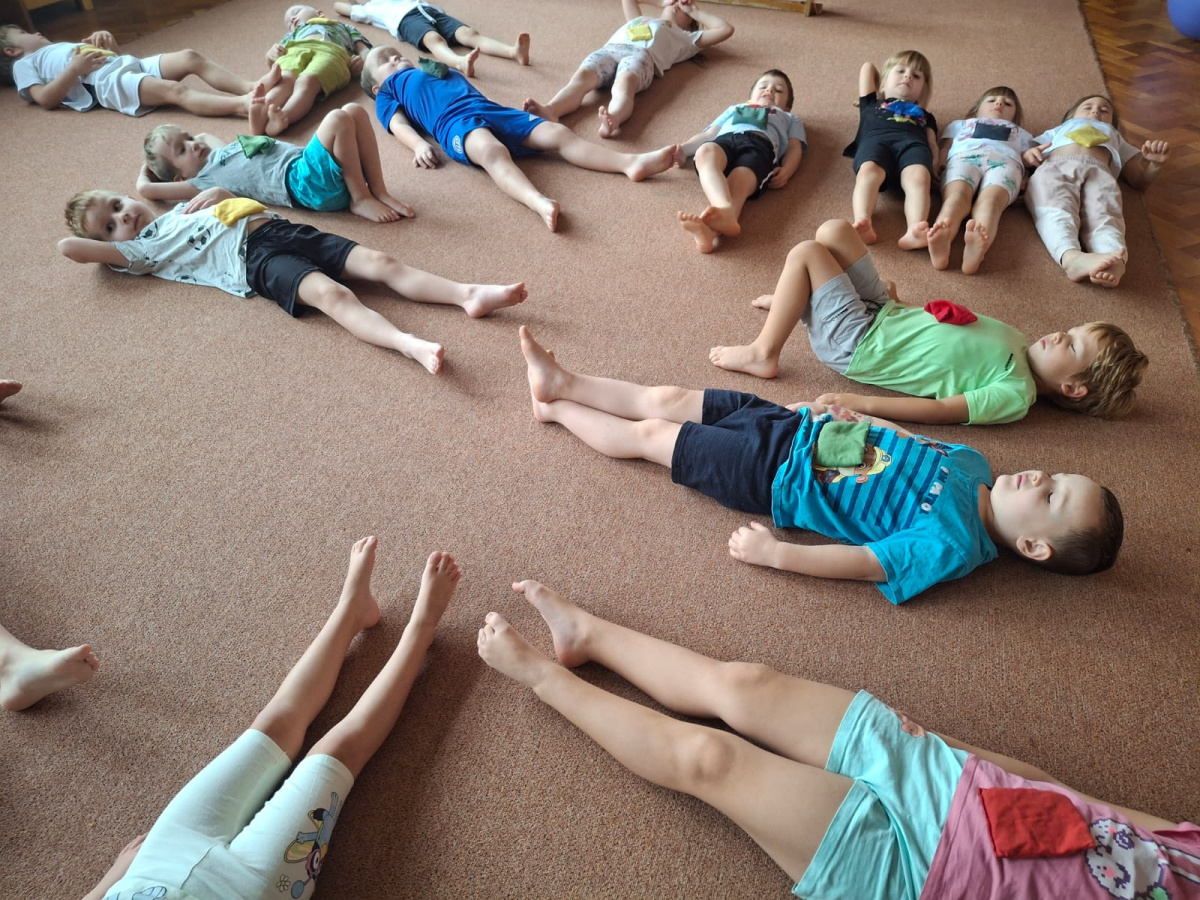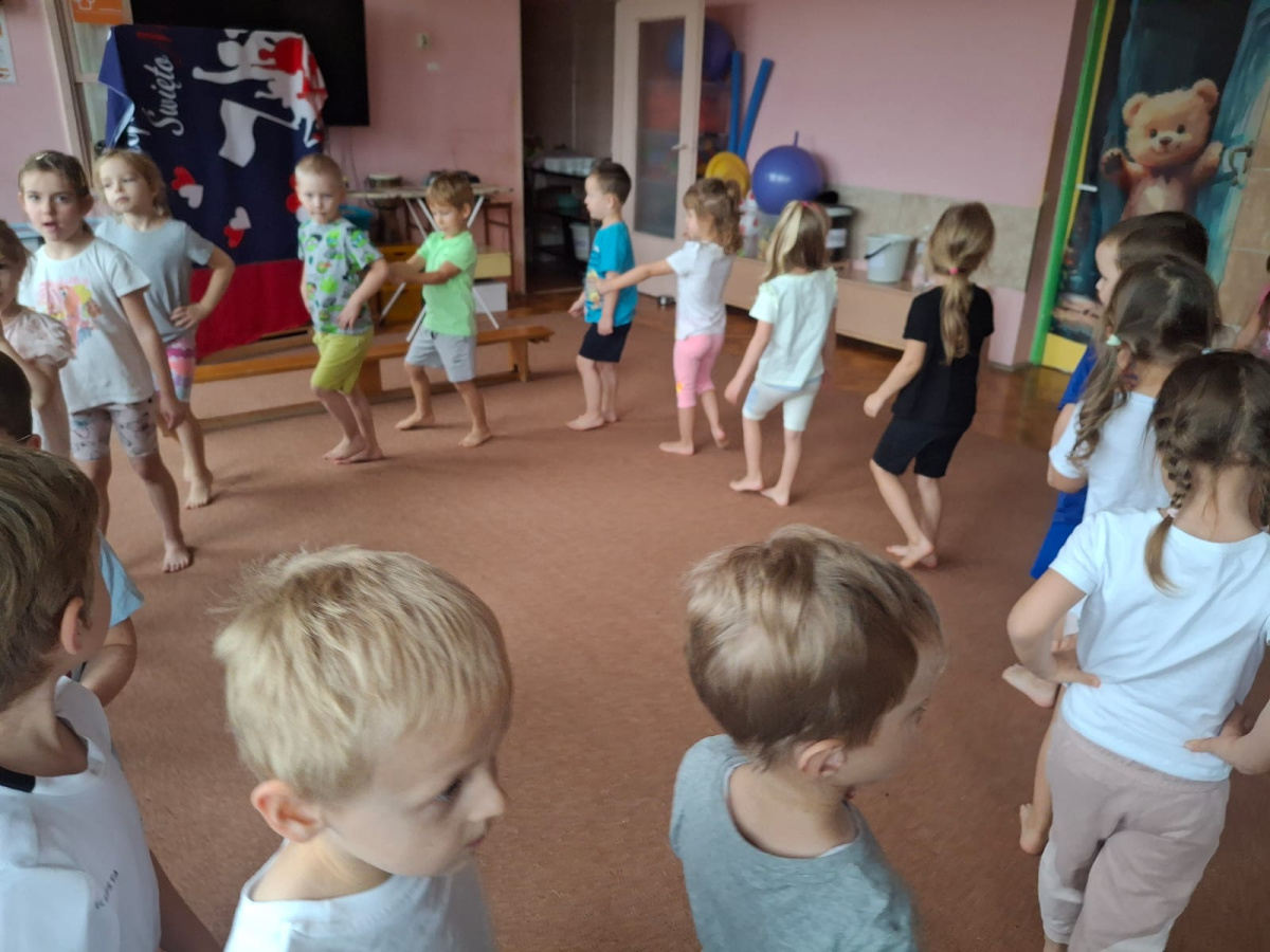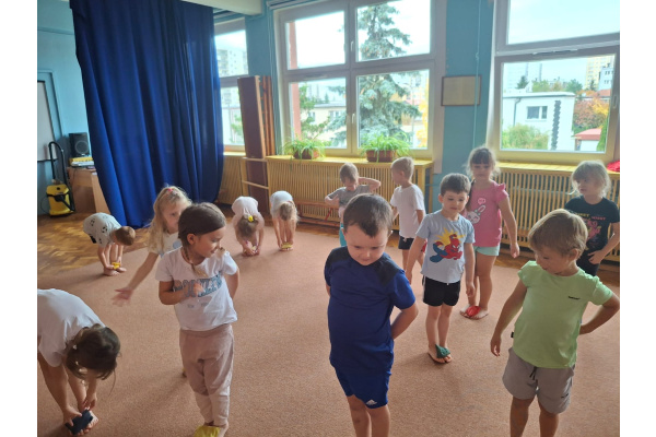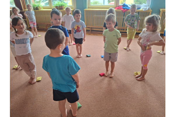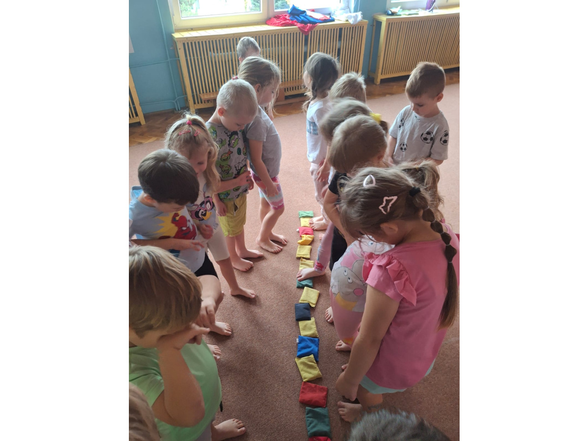 "Zestaw ćwiczeń gimnastycznych w Gr.V"- Po wakacjach dzieci z Gr.Sówek ćwiczą w strojach gimnastycznych na zajęciach. W czwartek ćwiczyły z woreczkami i utrwalały orientację w schemacie własnego ciała.