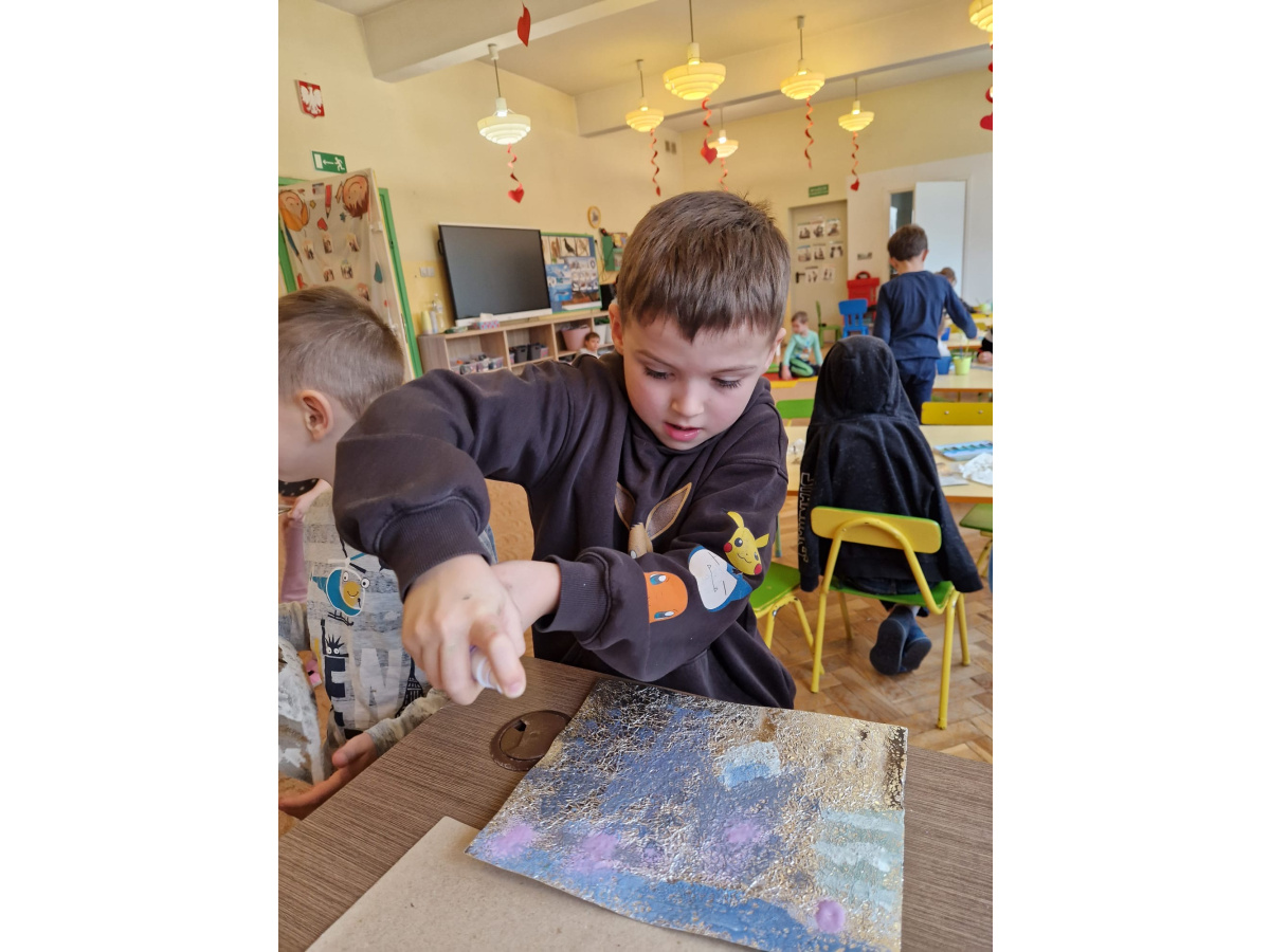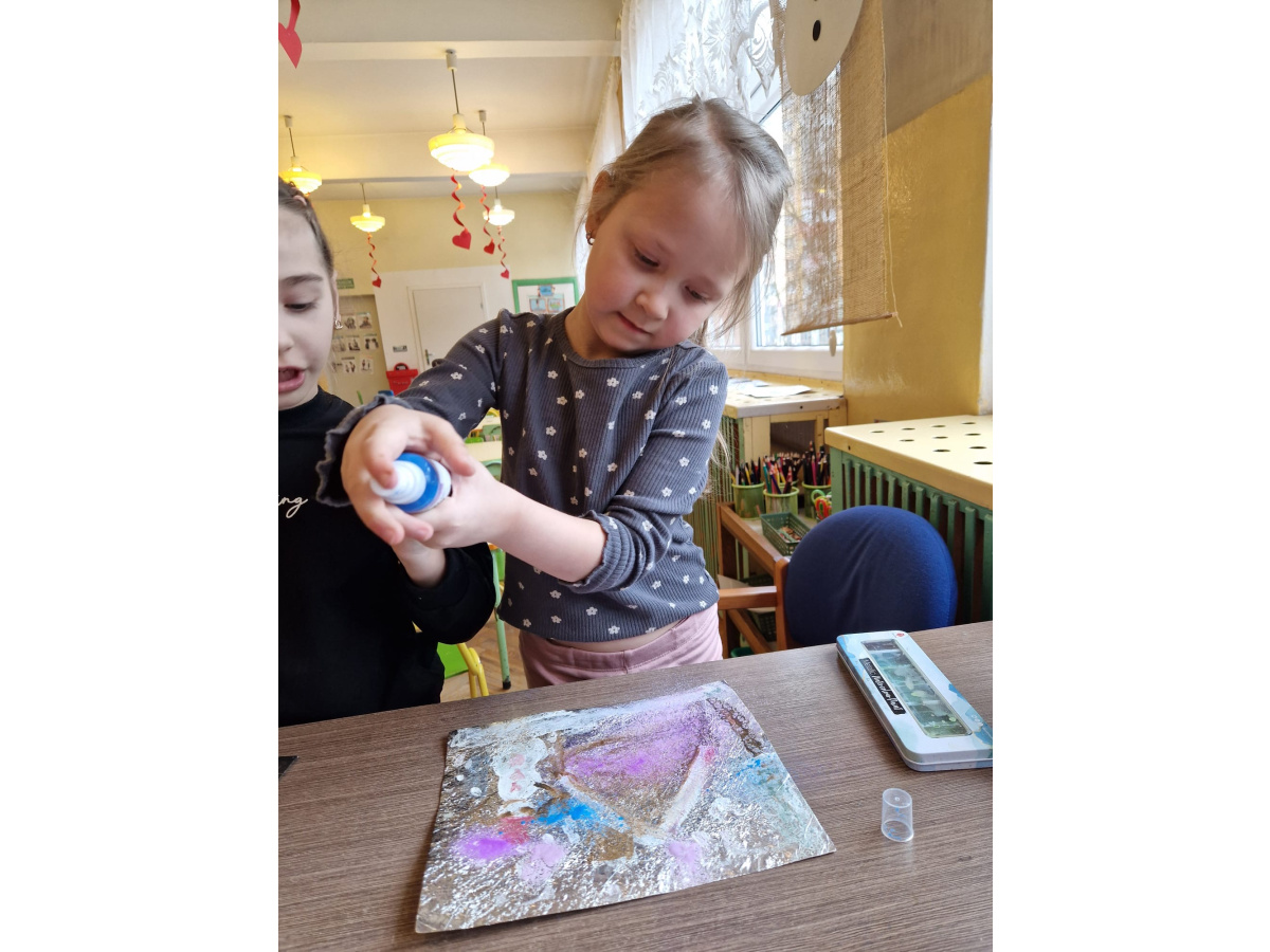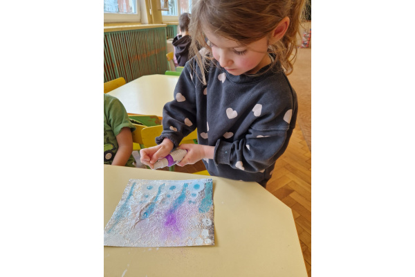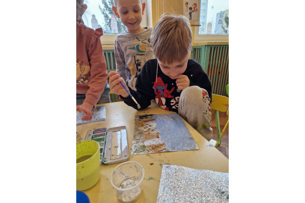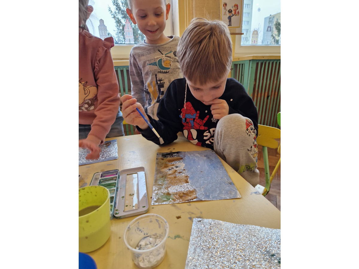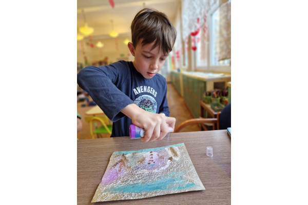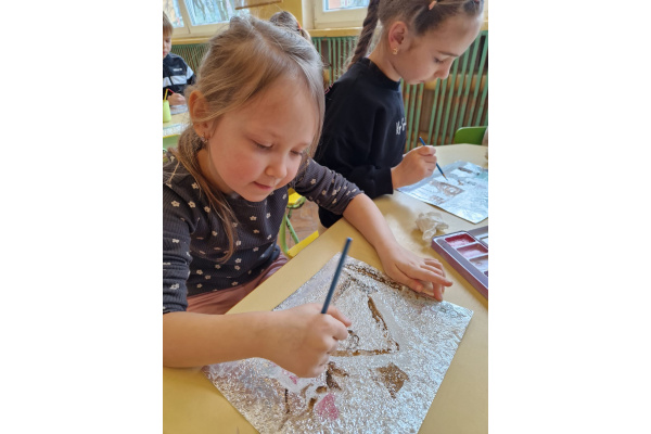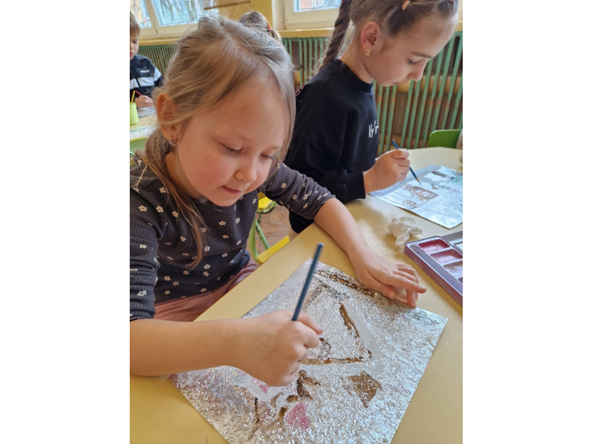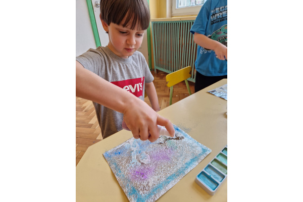 W grupie VI zakończyliśmy tydzień poświęcony zimowej tematyce. Rozmawialiśmy w nim o zimowych zwyczajach zwierząt, poznawaliśmy jak możemy pomóc przetrwać im ten trudny dla nich czas. Była też prezentacja multimedialna pokazująca ciekawostki związane ze śniegiem, lodem i szronem. Odwiedziliśmy też okolice Koła Podbiegunowego, by poznać życie Eskimosów i zwierząt zamieszkujących te zimne krainy. Na zakończenie wykonaliśmy pracę plastyczną w technice malowania na folii aluminiowej.. Efekty zaskoczyły nas samych, a można je oglądać na wystawie.