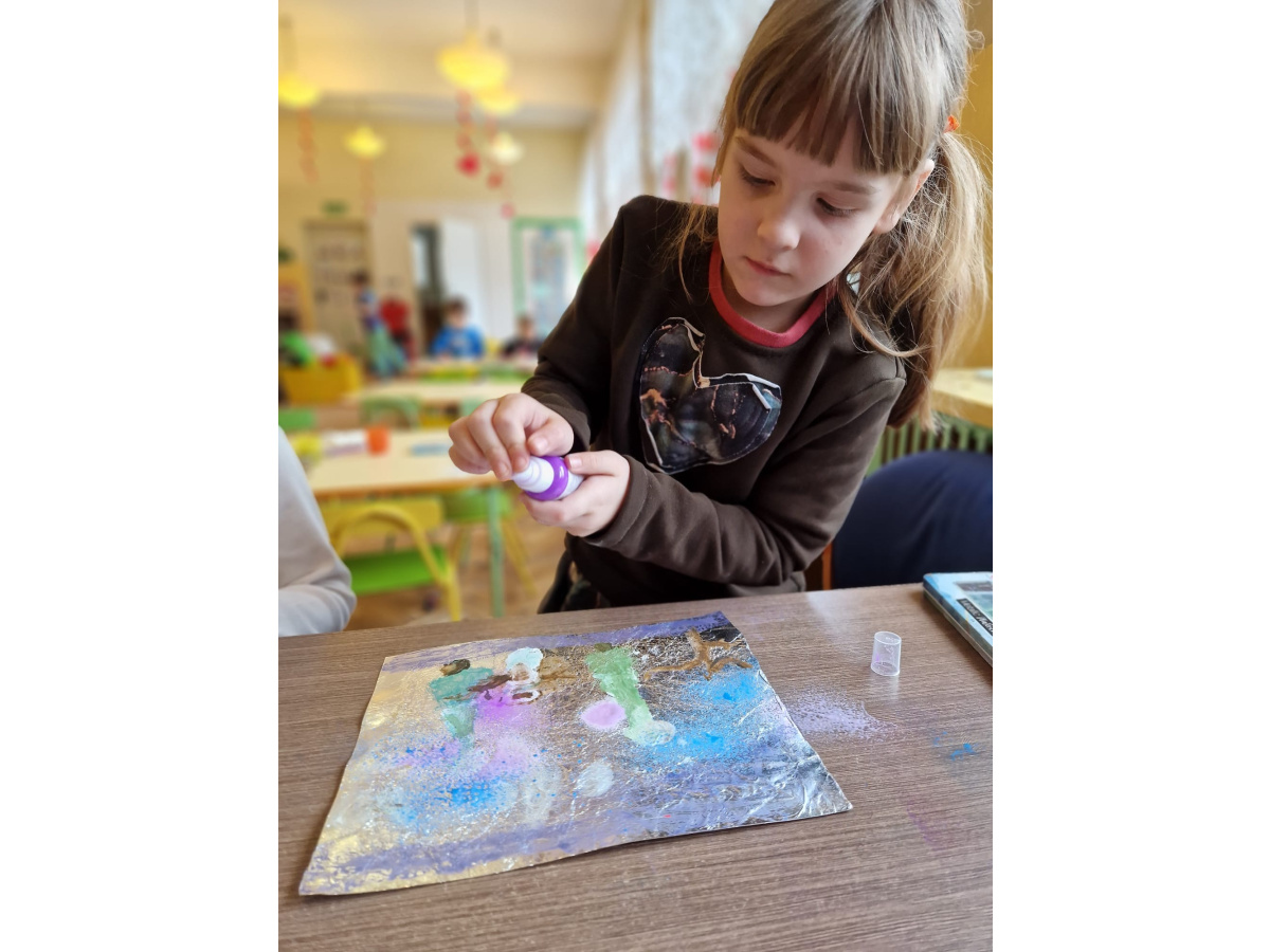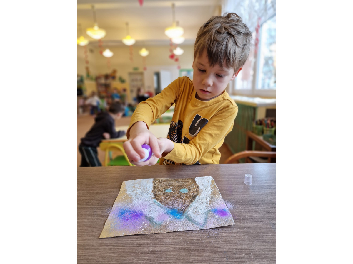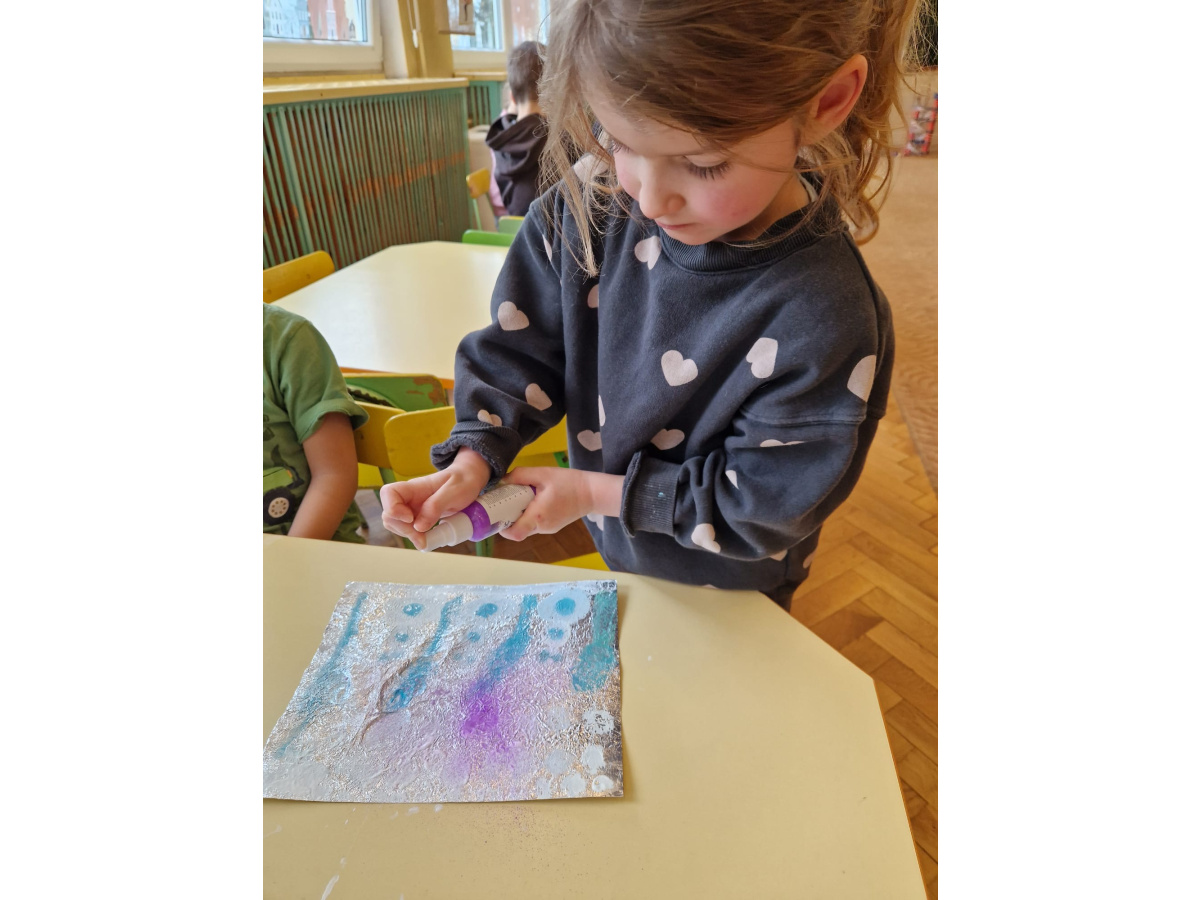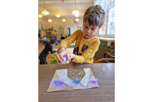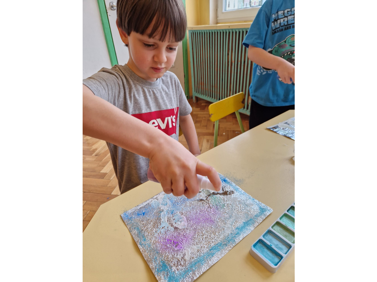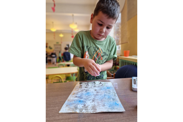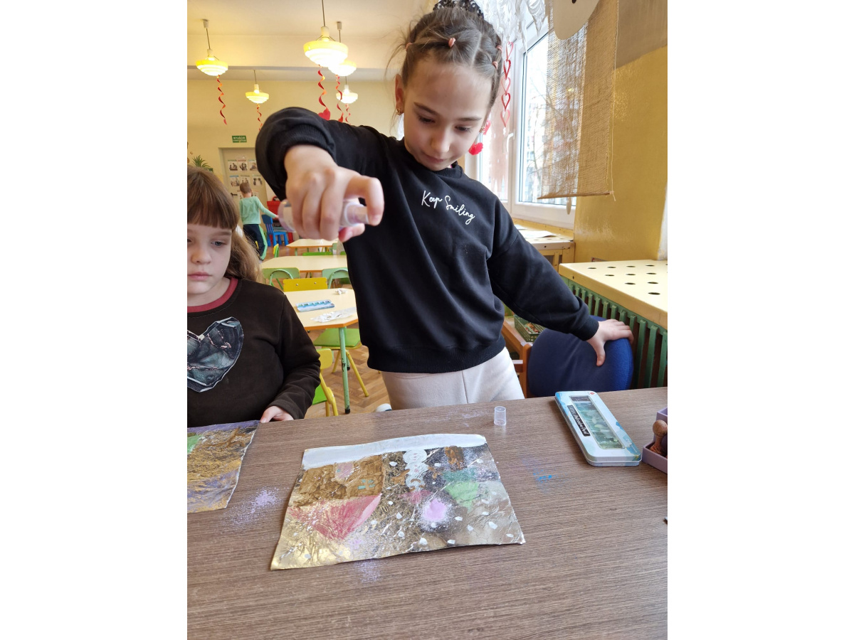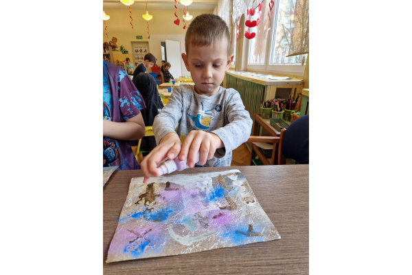 W grupie VI zakończyliśmy tydzień poświęcony zimowej tematyce. Rozmawialiśmy w nim o zimowych zwyczajach zwierząt, poznawaliśmy jak możemy pomóc przetrwać im ten trudny dla nich czas. Była też prezentacja multimedialna pokazująca ciekawostki związane ze śniegiem, lodem i szronem. Odwiedziliśmy też okolice Koła Podbiegunowego, by poznać życie Eskimosów i zwierząt zamieszkujących te zimne krainy. Na zakończenie wykonaliśmy pracę plastyczną w technice malowania na folii aluminiowej.. Efekty zaskoczyły nas samych, a można je oglądać na wystawie.