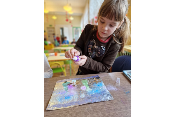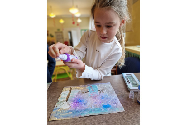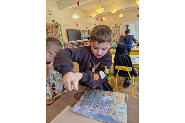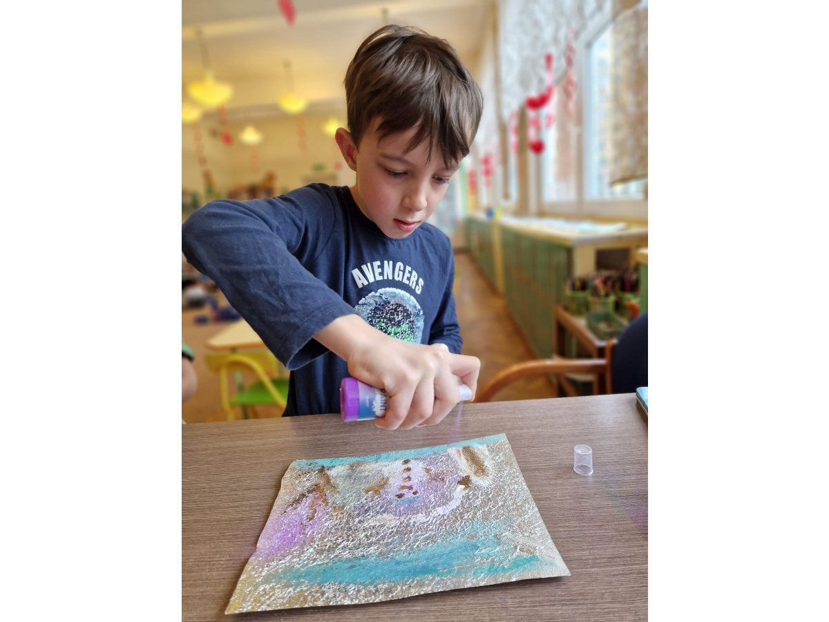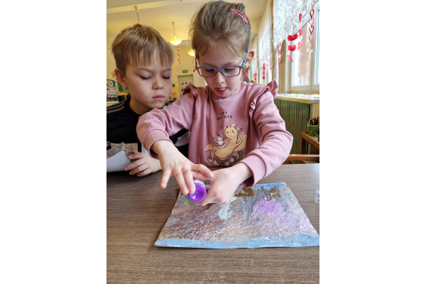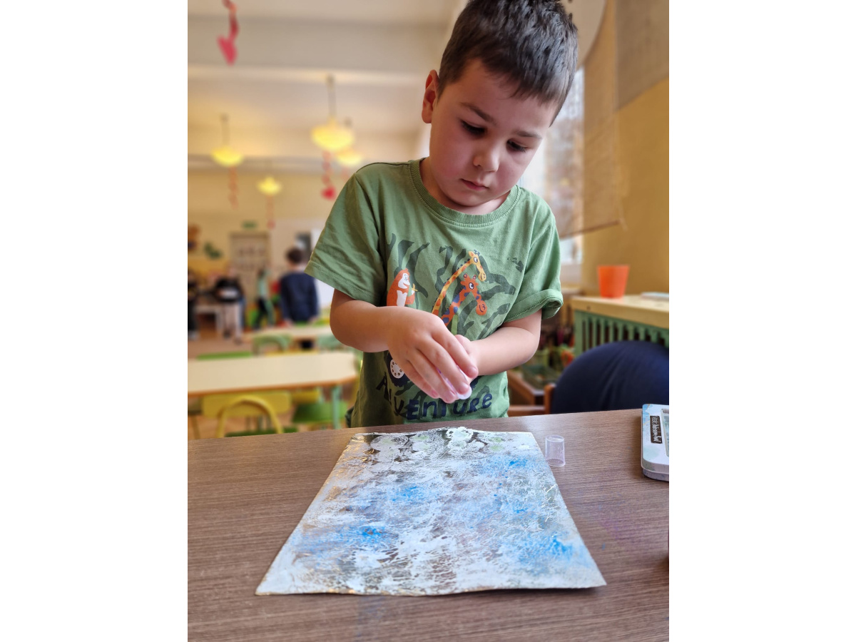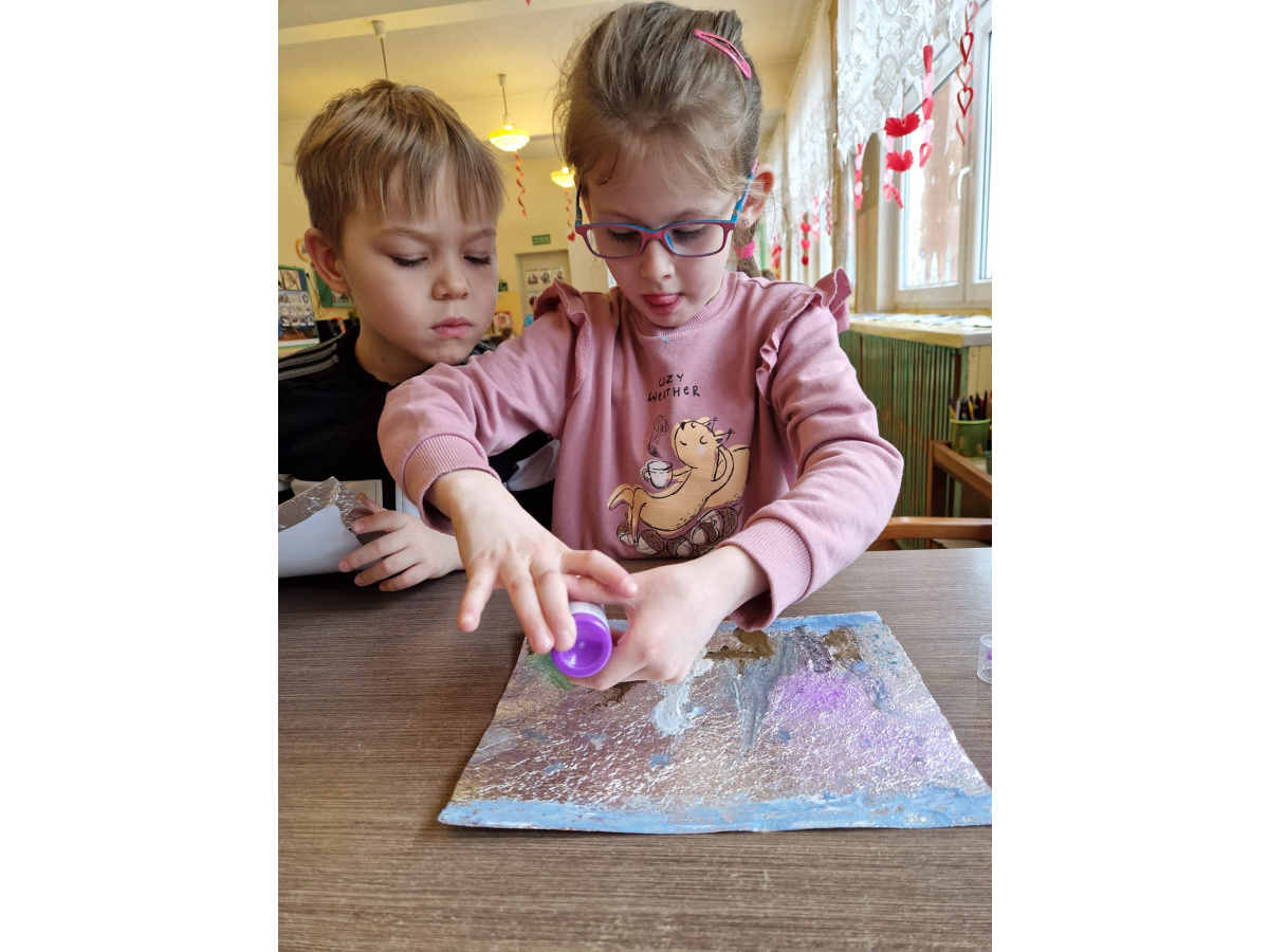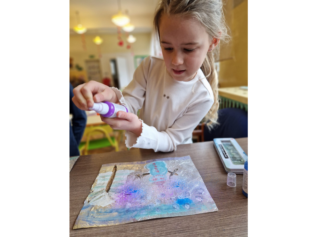 W grupie VI zakończyliśmy tydzień poświęcony zimowej tematyce. Rozmawialiśmy w nim o zimowych zwyczajach zwierząt, poznawaliśmy jak możemy pomóc przetrwać im ten trudny dla nich czas. Była też prezentacja multimedialna pokazująca ciekawostki związane ze śniegiem, lodem i szronem. Odwiedziliśmy też okolice Koła Podbiegunowego, by poznać życie Eskimosów i zwierząt zamieszkujących te zimne krainy. Na zakończenie wykonaliśmy pracę plastyczną w technice malowania na folii aluminiowej.. Efekty zaskoczyły nas samych, a można je oglądać na wystawie.